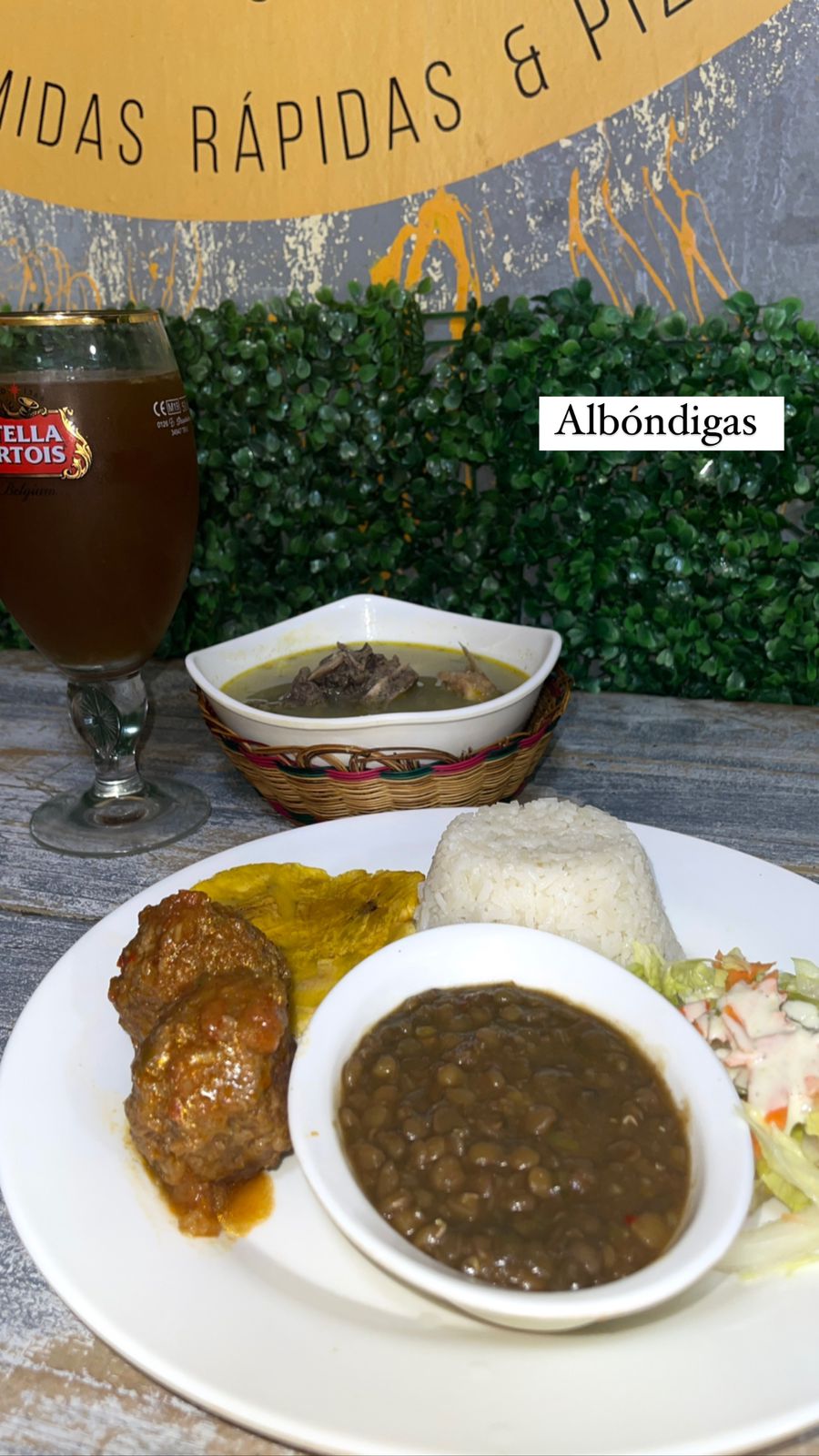Albondiga, arroz, granos, ensalada del día y sopa del día