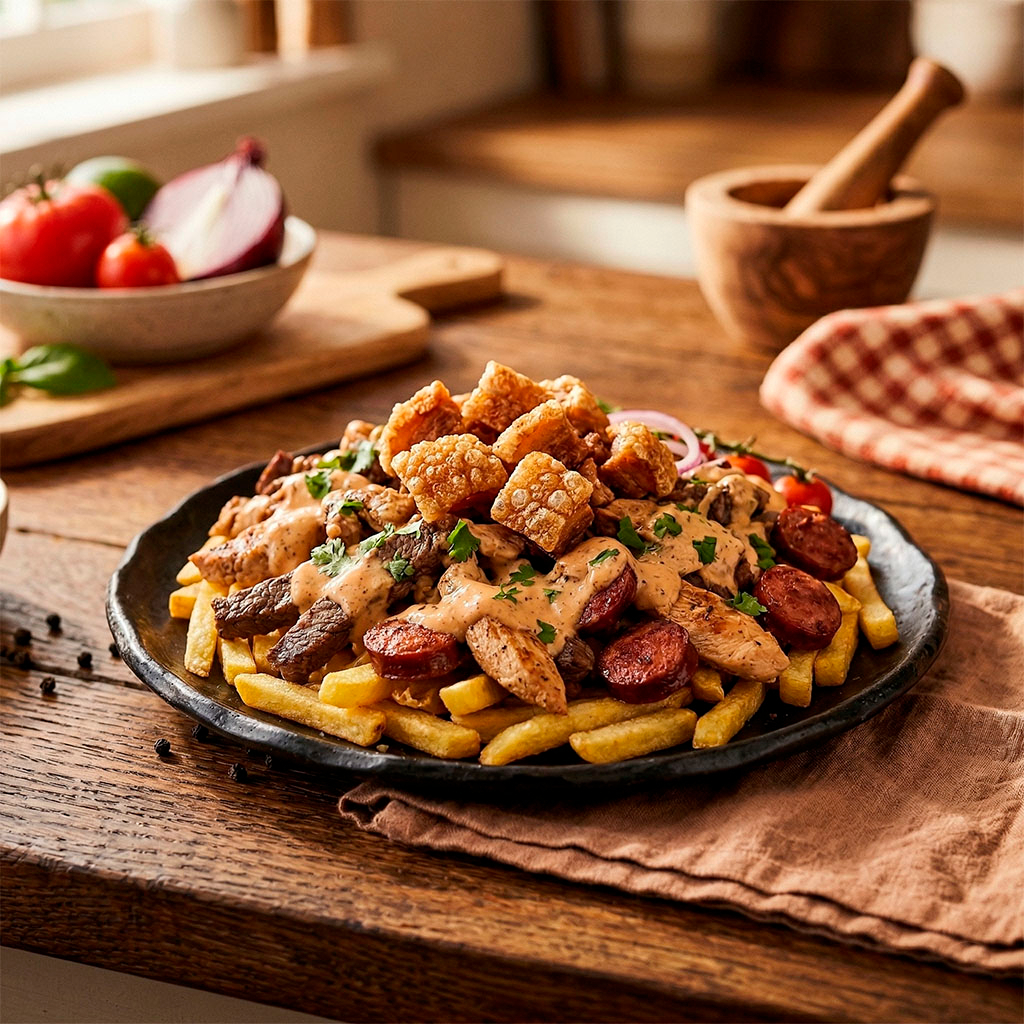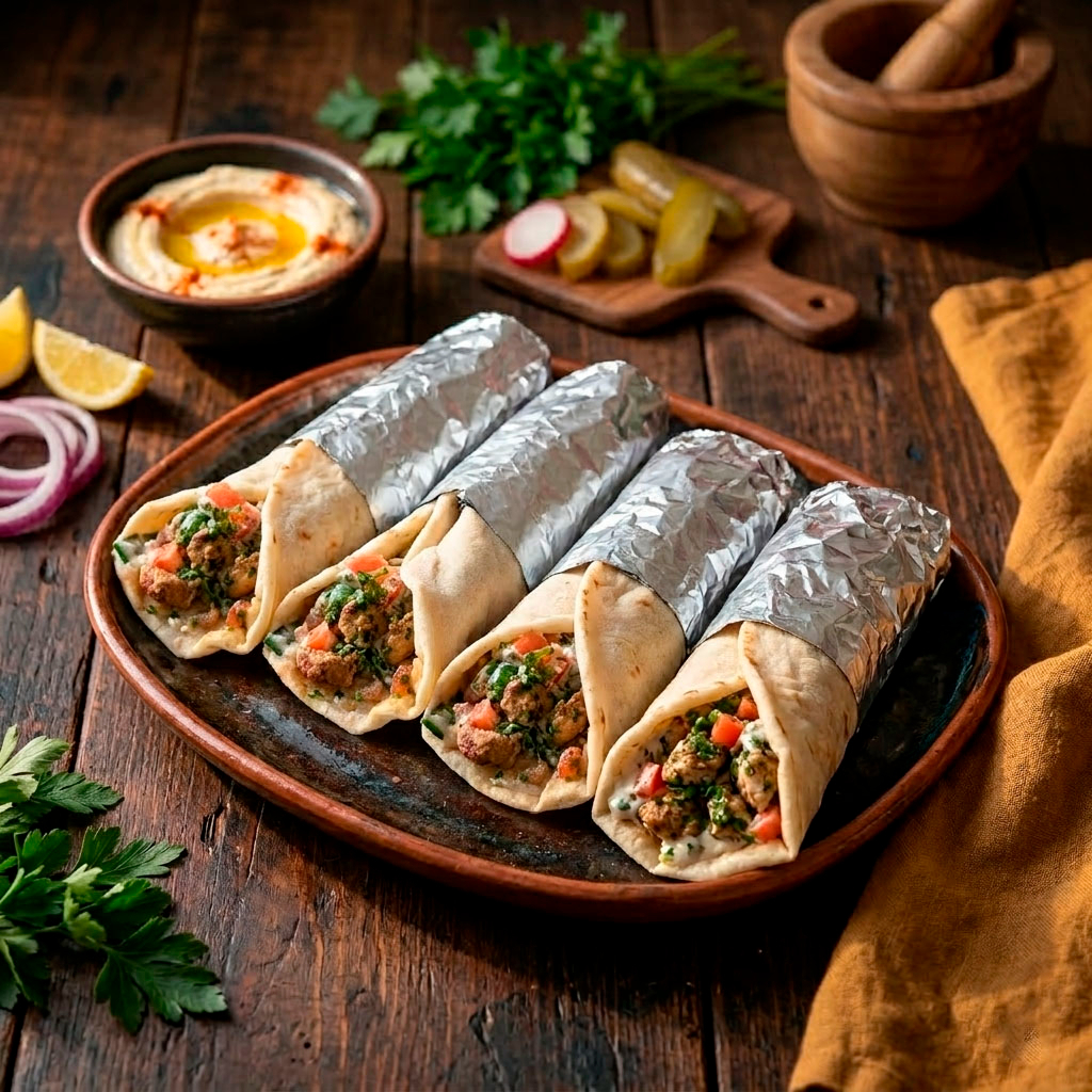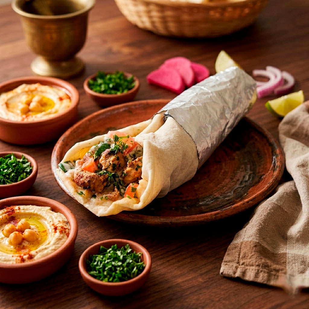 Trocitos de pollo marinados con especias tradicionales y asados a la perfección, envueltos en suave pan árabe con vegetales frescos y nuestra irresistible salsa de ajo de la casa.