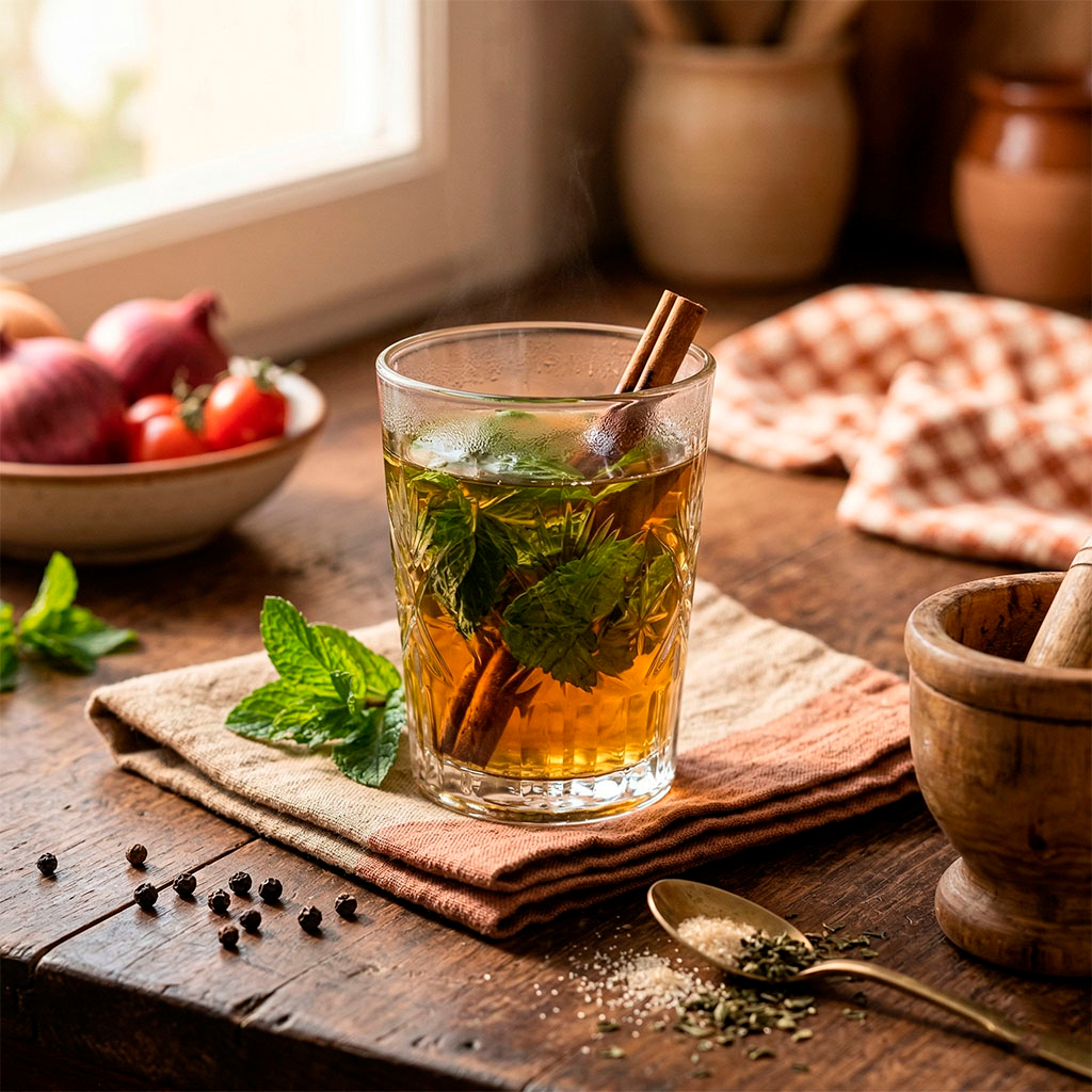 Tradicional té caliente aromatizado con menta fresca y canela, el toque perfecto para cerrar tu experiencia árabe.