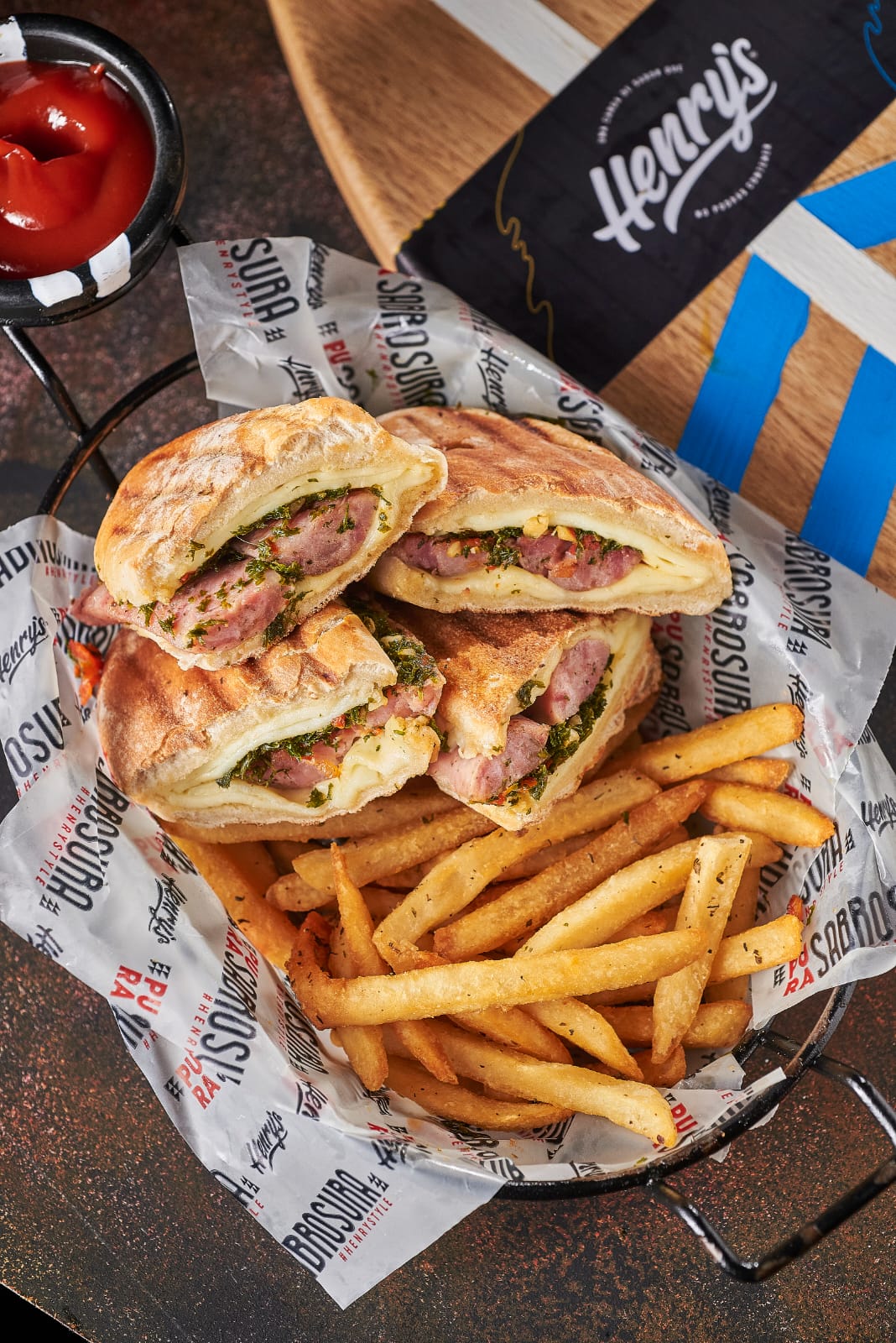 Pan brioche de orégano sellado con mantequilla de tomillo, mix de cogollo europeo con tártara henry's, salchicha alemana henry's, queso mozzarella fundido, cebolla crunchy, salsa rosada y piña natural de la casa, toppig de cebollin, acompañado de papas a la francesa.