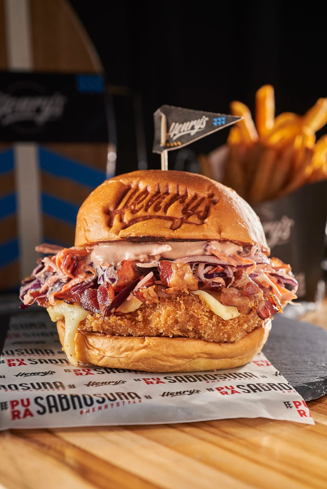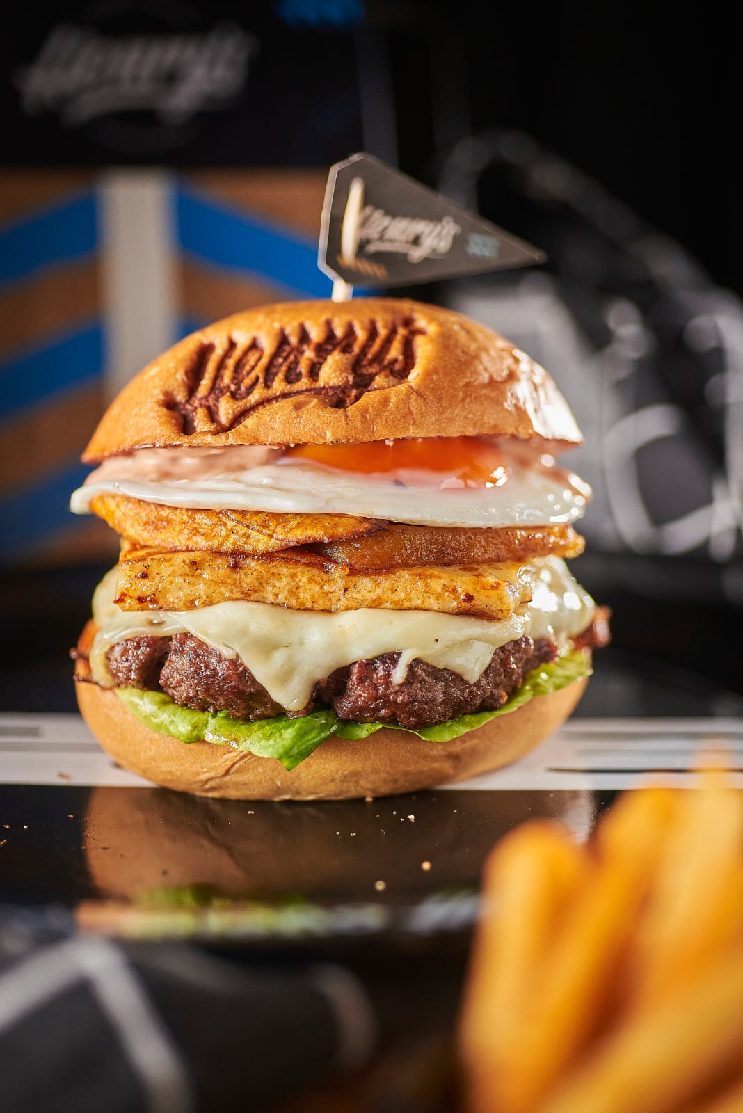 Pan brioche de orégano sellado con mantequilla de tomillo, burguerdor henry's tiene carne de hamburguesa rellena de queso cheddar, pera caramelizada en reducción de panela, tocineta crunchy, queso mozzarella fundido, papita crunchy, salsa coolsteña, acompañado de papas a la francesa.