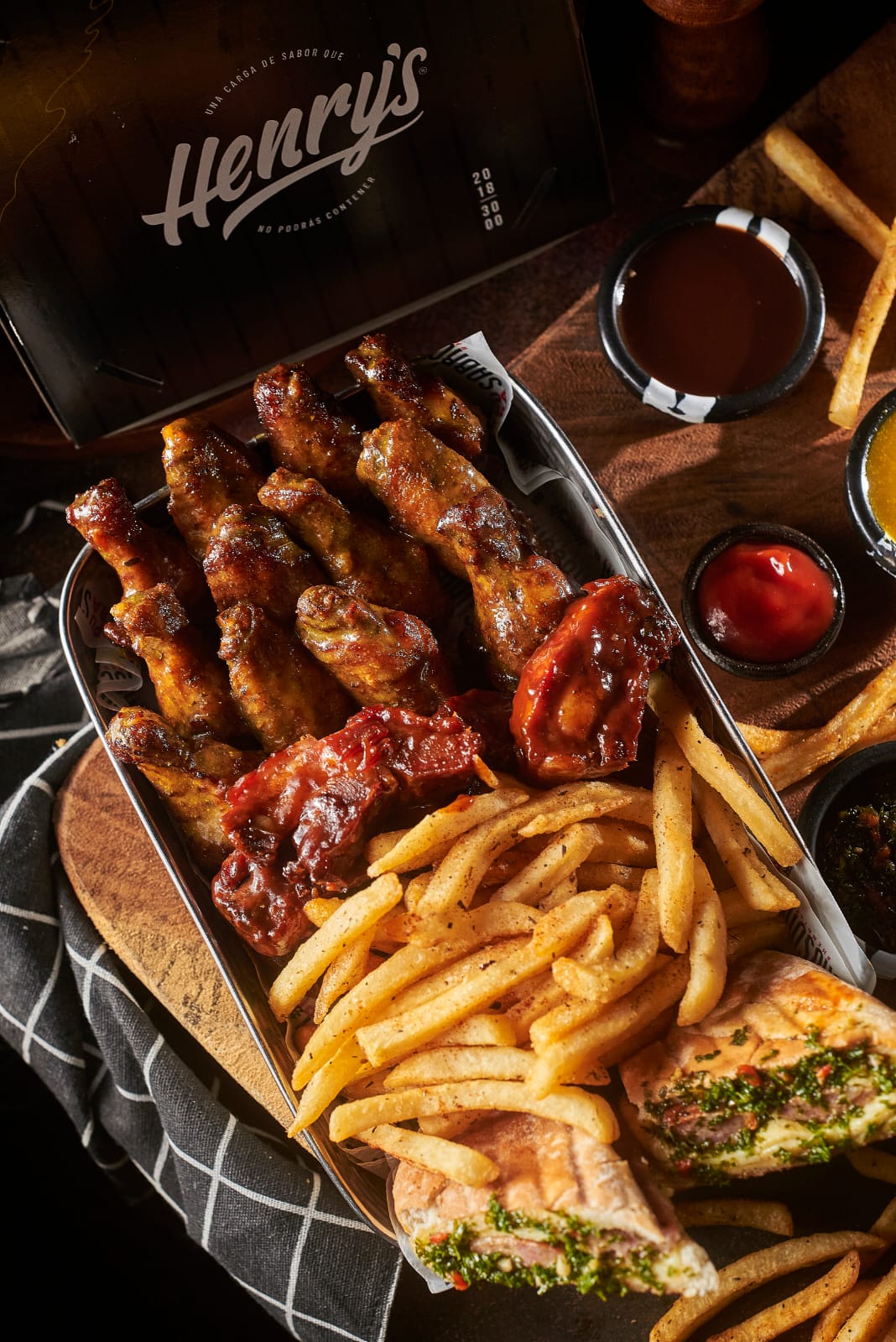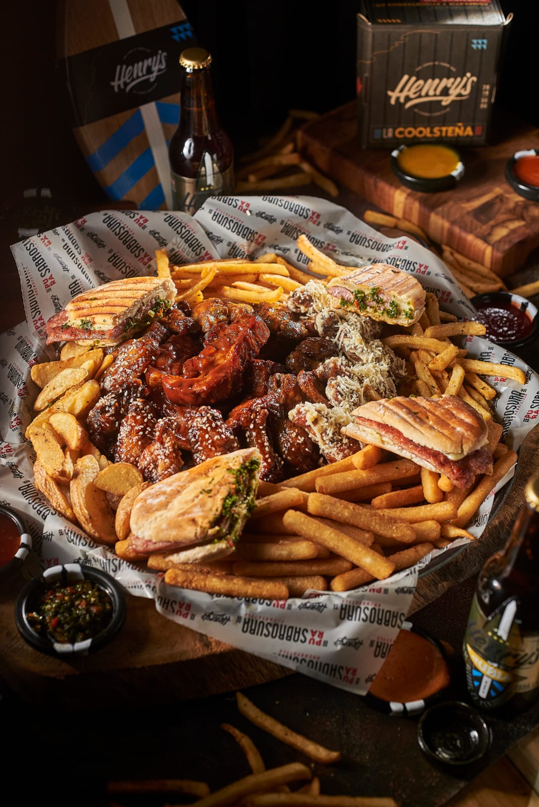 Papas henry's, chorizo argentino, tocineta crispy, queso cheddar, queso parmesano y salsa de la casa.