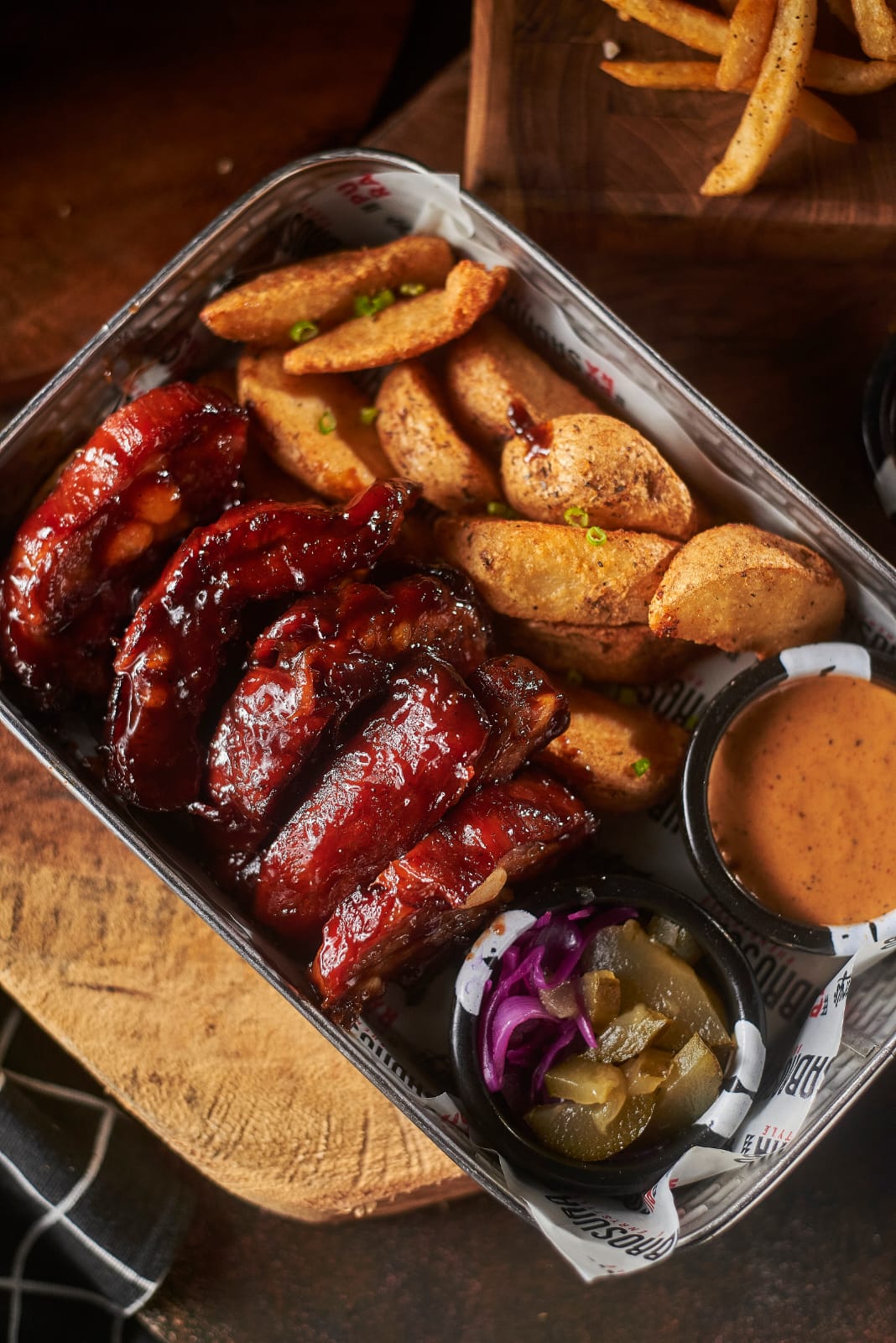 Costilla ahumada al barril glaseada en BBQ de corozo y tamarindo, acompañadas de papas rústicas con una super cobertura crispy, salsa coolsteña henry's y una porción de pepinillos agridulce y cebollitas encurtidas.