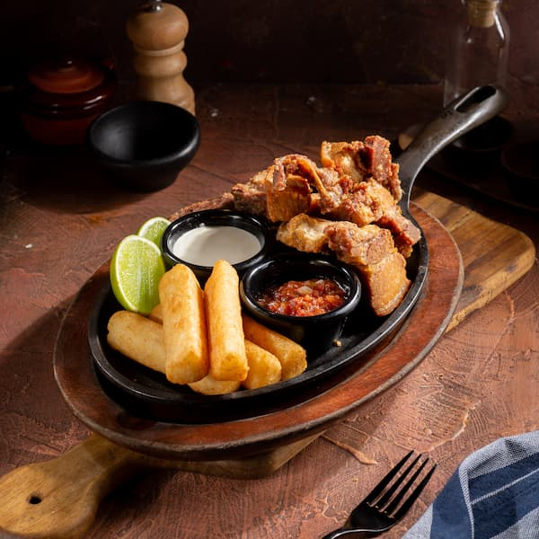 Chicharrón, cortes de tocineta acompañado de croquetas de yuca, acompañado de sour cream, picante suave y cascos de limón.