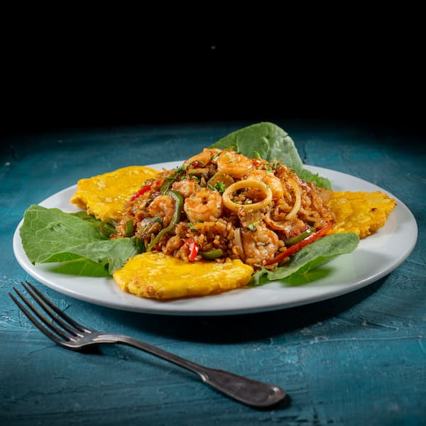 Arroz con camarón, calamar, caracol y pulpo con vegetales crujientes (cebolla y pimentón). servido con patacones de la casa.