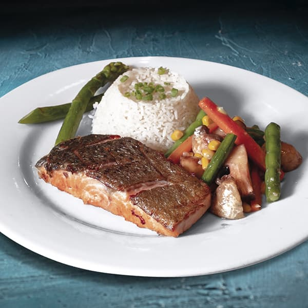 Salmón con champiñón, zanahoria, maíz tierno, habichuela y espárragos verdes. acompañado con arroz blanco.