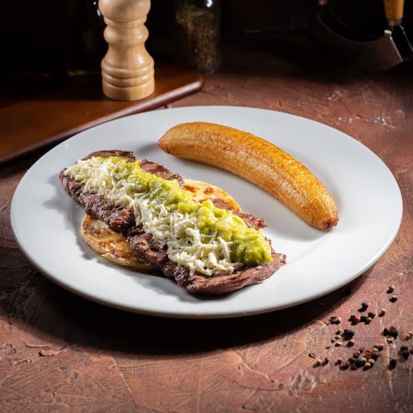 Lomo fino 250 g sobre una arepa de maíz, queso mozzarella, guacamole, queso costeño y banano de la casa.