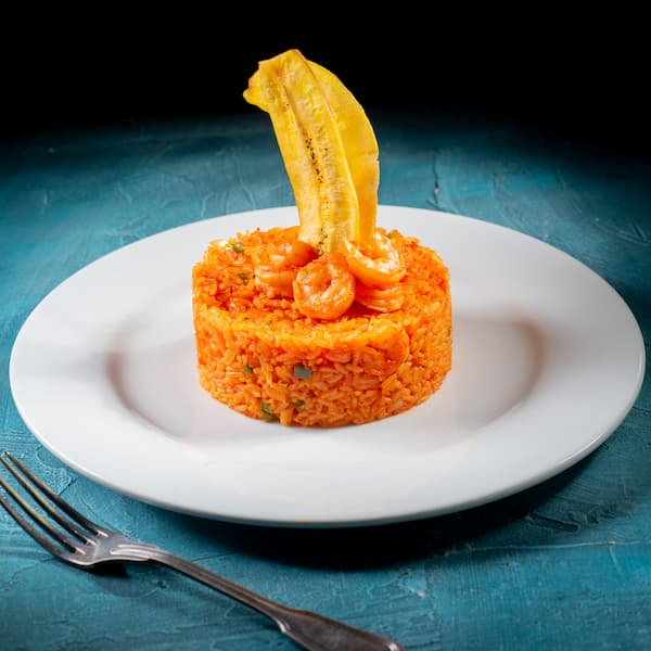 Arroz con camarones decorado con tajadas de plátano verde.