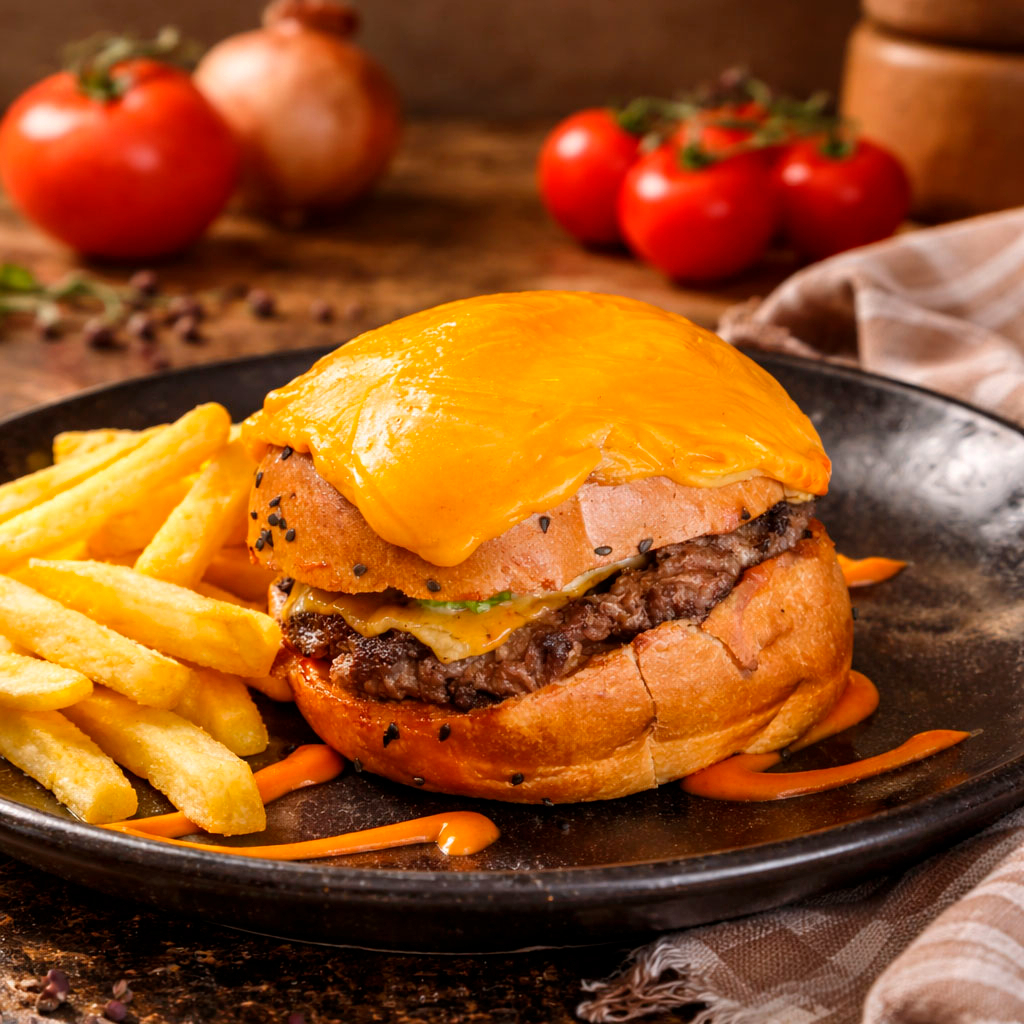 Jugosa carne Angus a la parrilla, queso cheddar derretido, tocineta caramelizada, tomate y lechuga frescos. Todo en un pan brioche suave y doradito con nuestra salsa secreta.