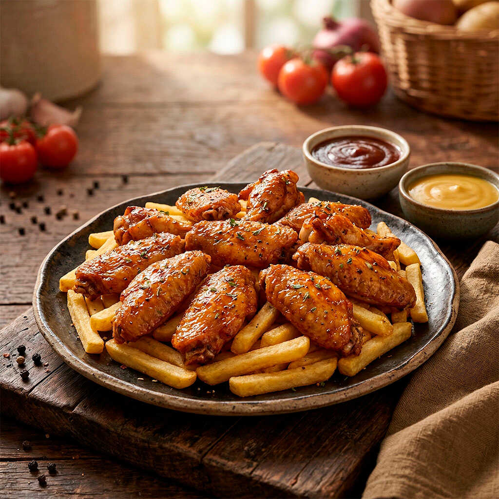 Doce alitas de pura sabrosura para compartir. Una porción generosa con cama de papas a la francesa y tu salsa favorita: BBQ clásica o Miel Mostaza.