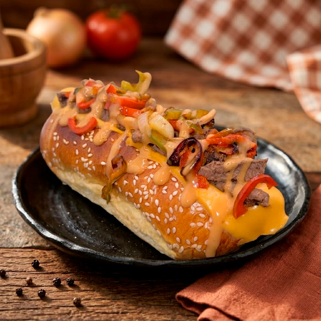 El de la casa para el hambre grande. Pan brioche, salchicha americana, carne picada, tocineta caramelizada, queso cheddar derretido, vegetales frescos y salsas de la casa.