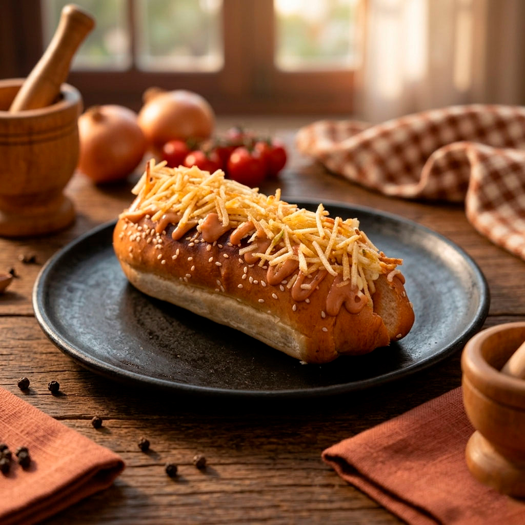 El sabor de la costa en cada mordisco. Pan brioche , salchicha americana , abundante queso costeño rallado , toque crujiente de papita ripio y salsa de la casa.