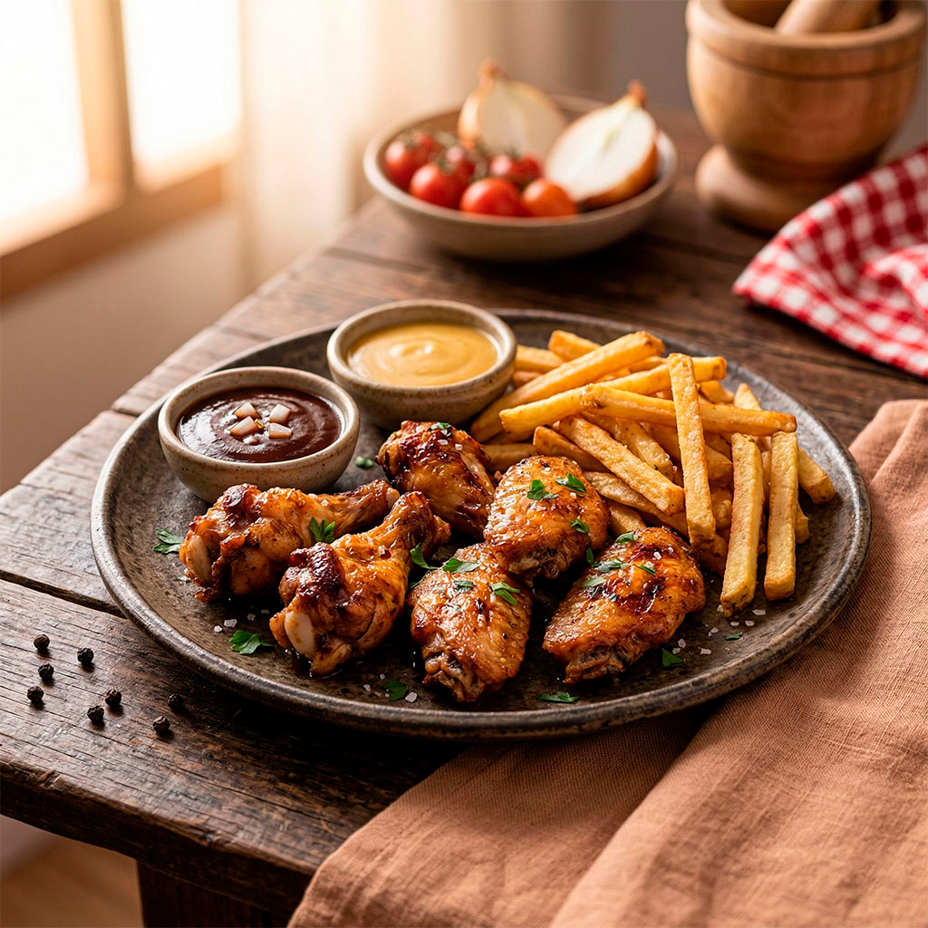 Seis alitas jugosas por dentro y doraditas por fuera. Acompañadas de papas a la francesa crujientes y tu salsa favorita: BBQ clásica o Miel Mostaza.