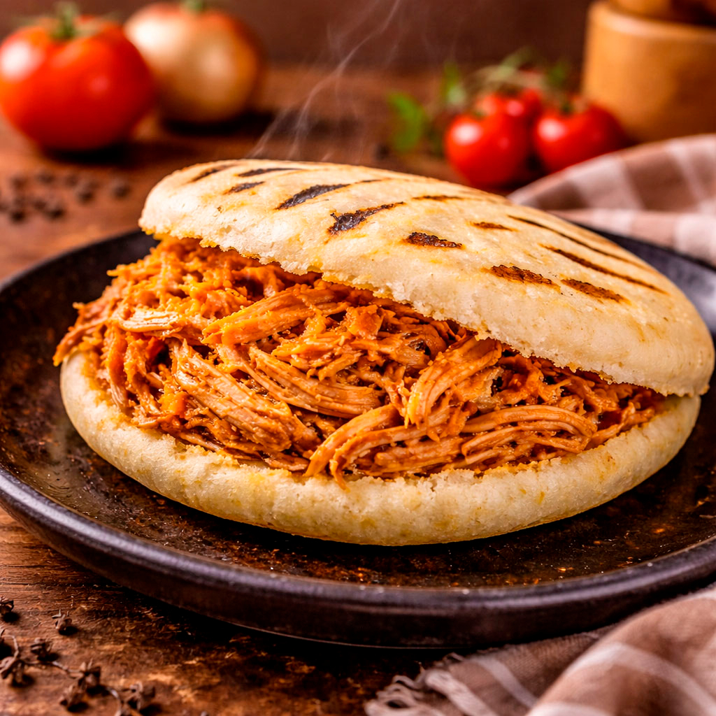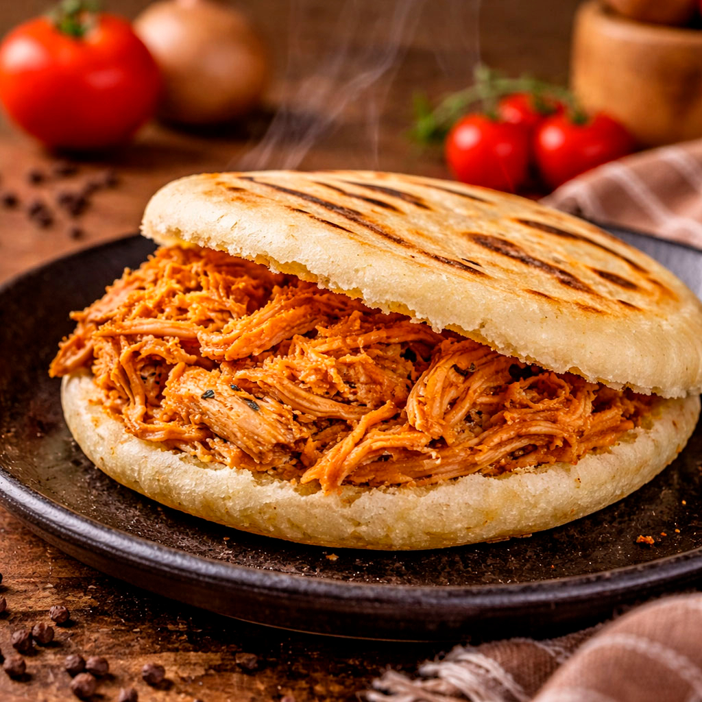 Arepa artesanal rellena de jugoso pollo desmechado y bien sazonado. Una opción llena de sabor y proteína.