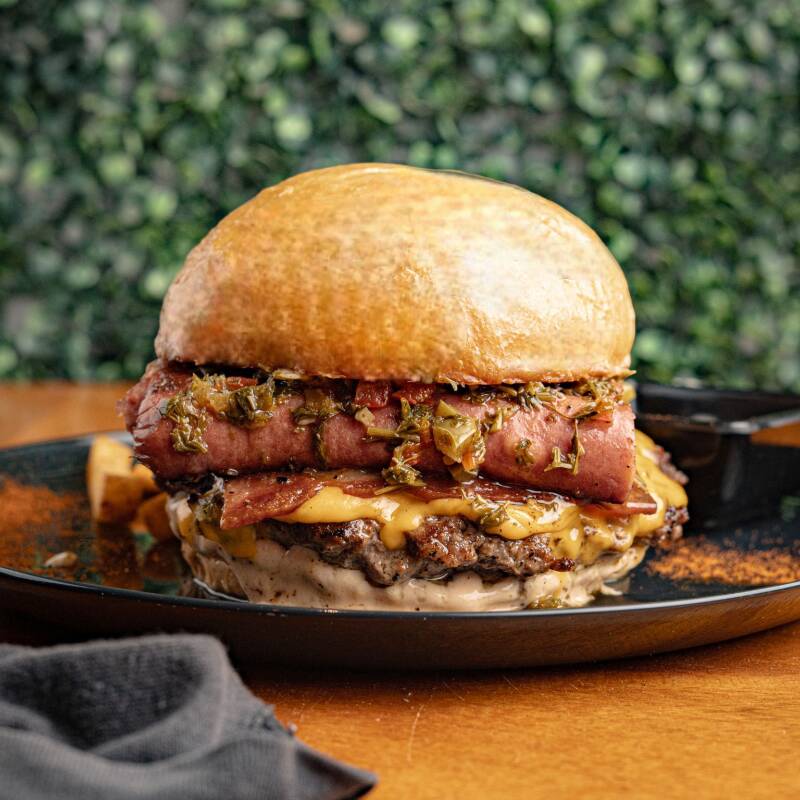 Pan brioche artesanal, 150 gr de Carne Angus, tocineta ahumada artesanal, chorizo argentino artesanal, chimichurri, salsa de la casa y papas a la francesa
