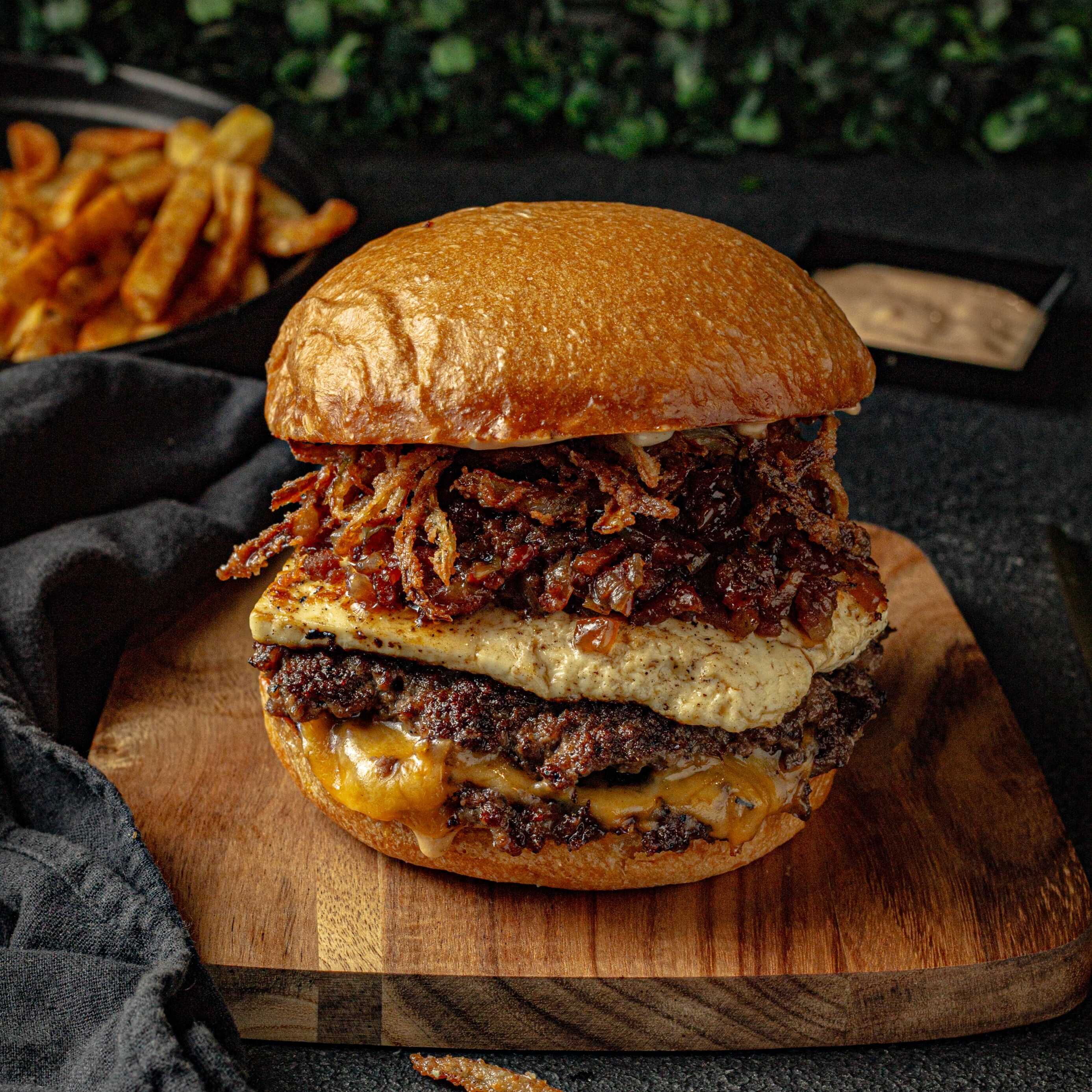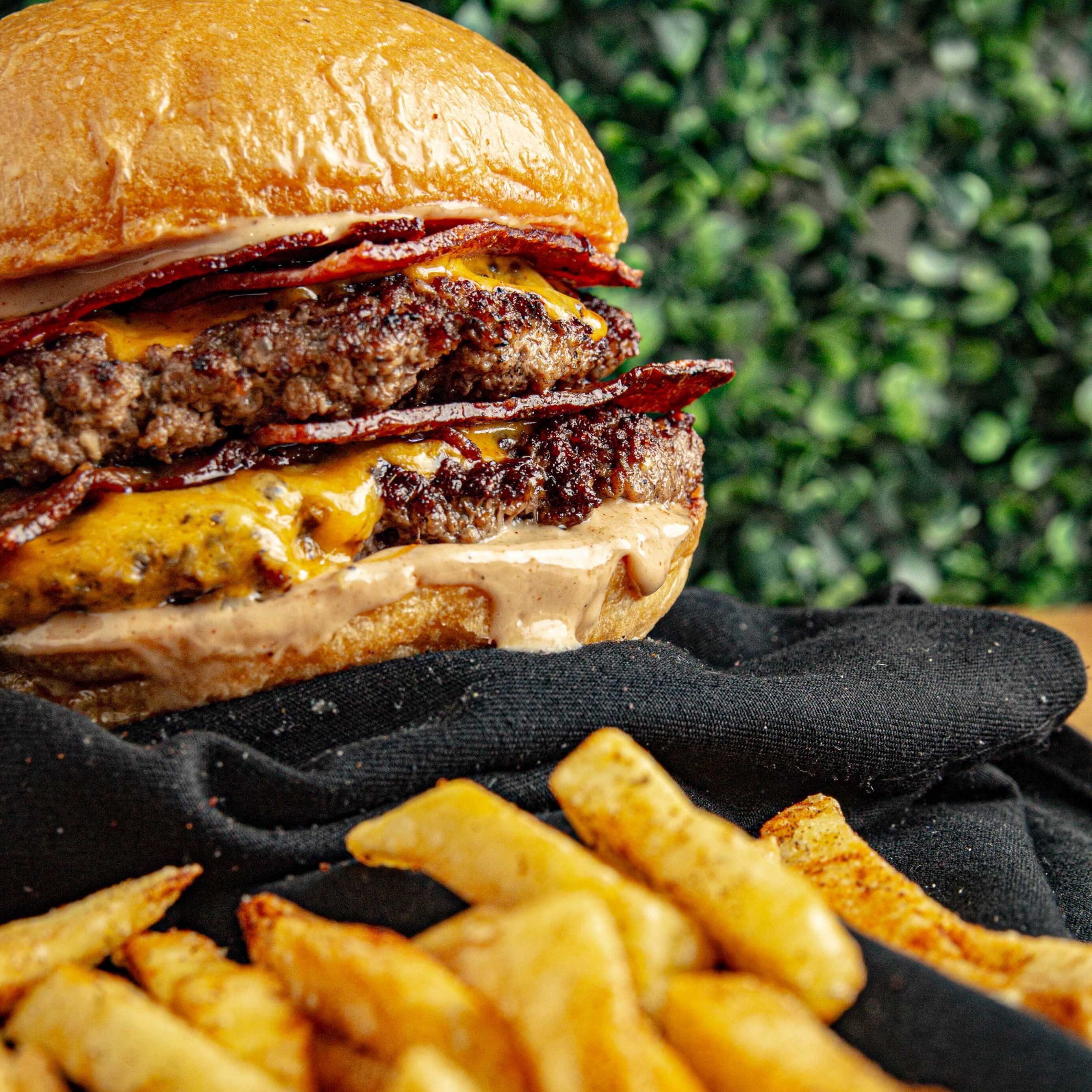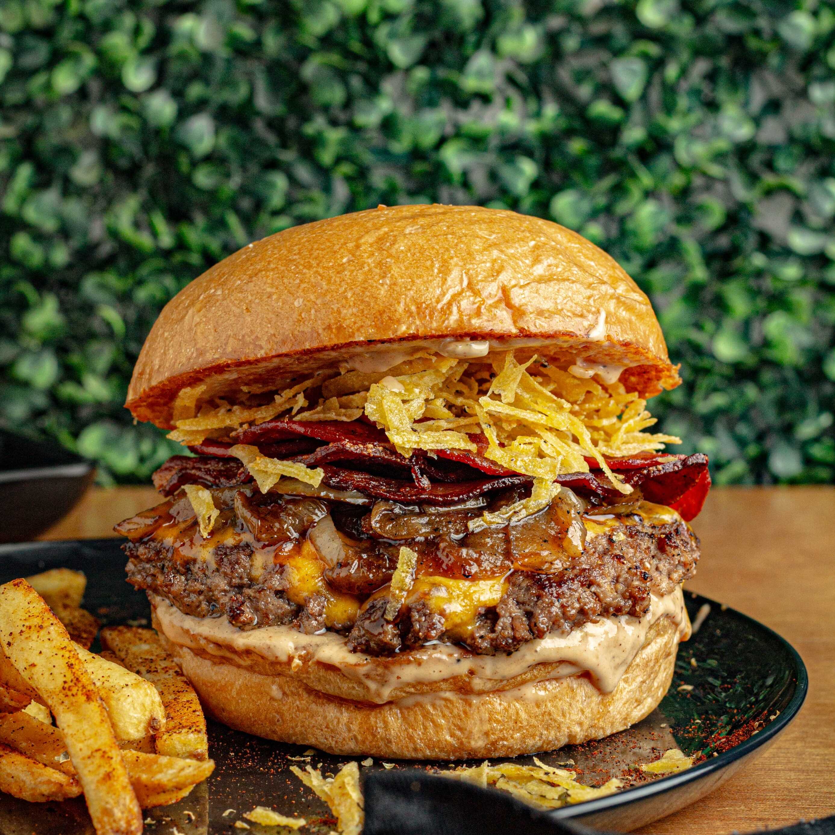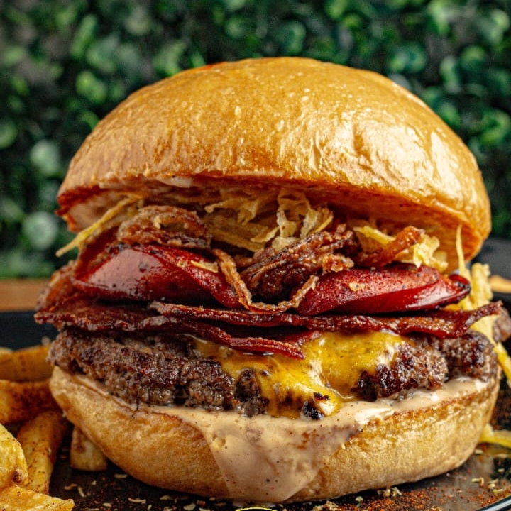 Pan brioche artesanal, doble Carne Angus, tocineta ahumada artesanal, queso americano, queso costeño asado, mermelada de tocino, cebolla crispy, salsa secreta de la casa y papas a la francesa