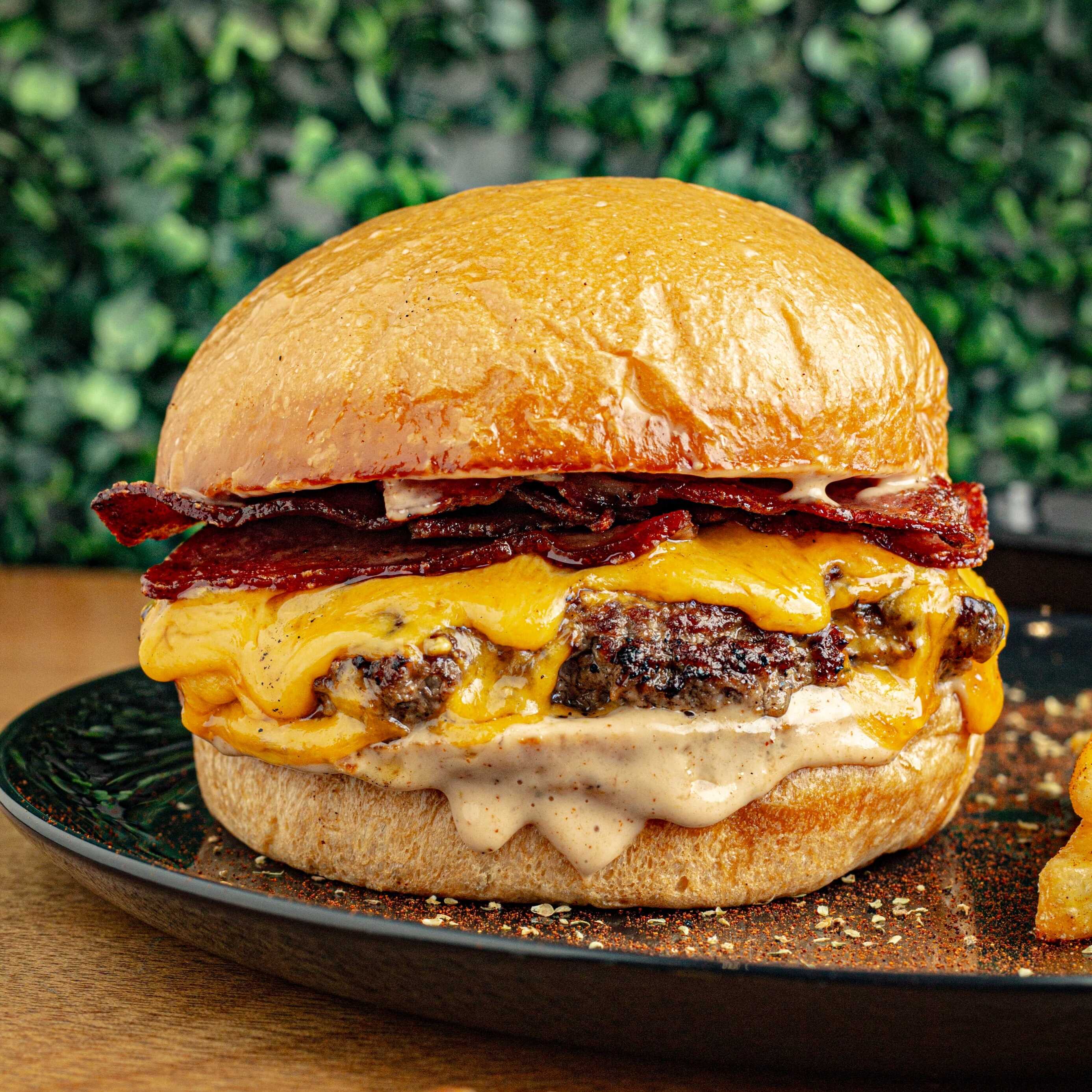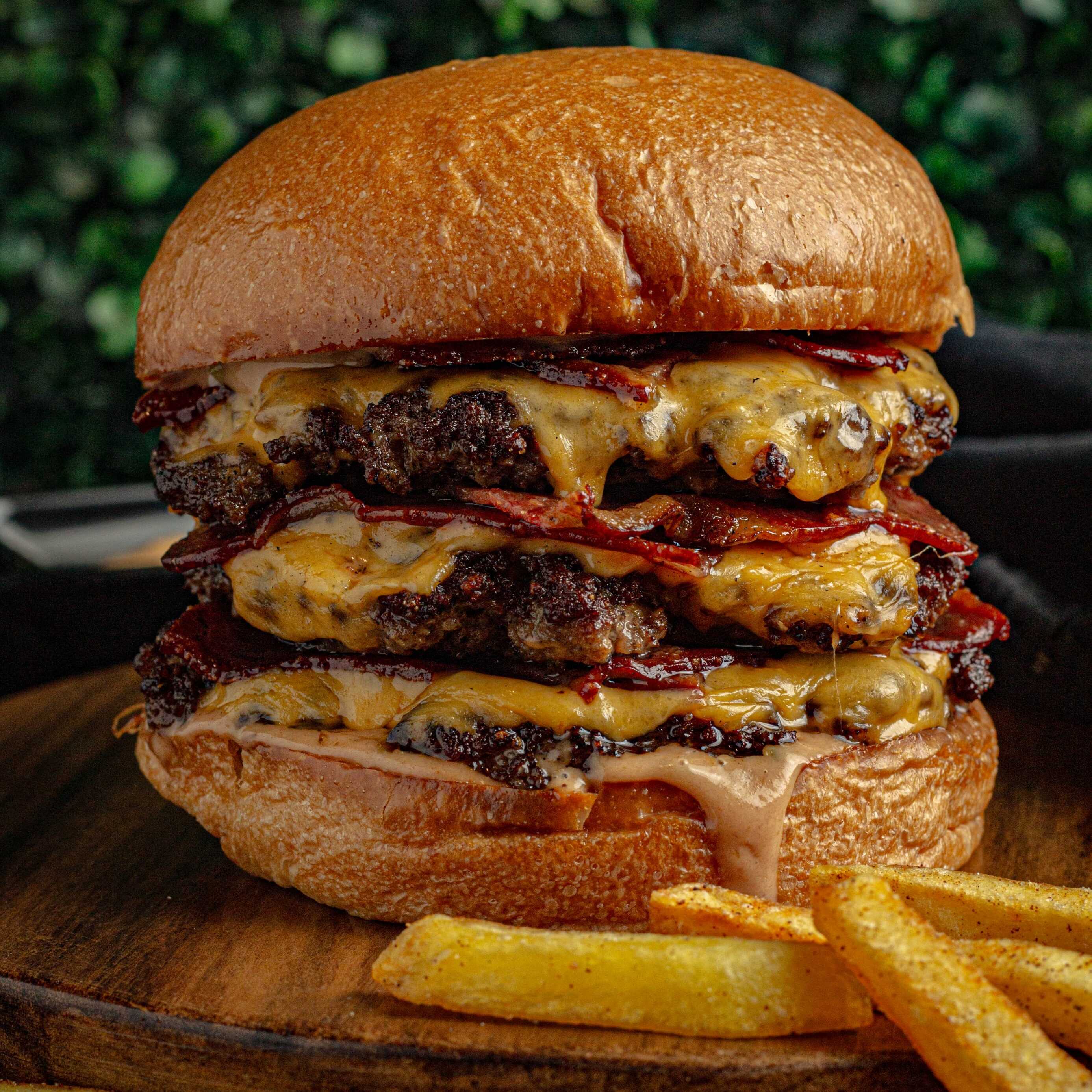 Pan brioche, 450 gr de carne Angus Beef ®, triple queso chedar, triple tocineta ahumada artesanal, salsa secreta de la casa y papas a la francesa