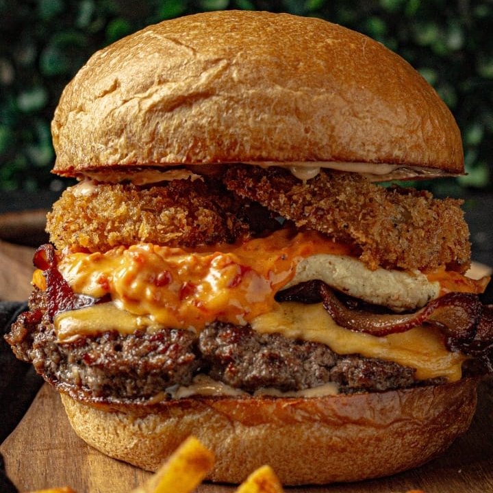 Pan brioche artesanal, 150 gr de Carne Angus, queso cheddar, queso costeño asado, dip de pimenton, aros de cebolla, salsa secreta de la casa y papas a la francesa