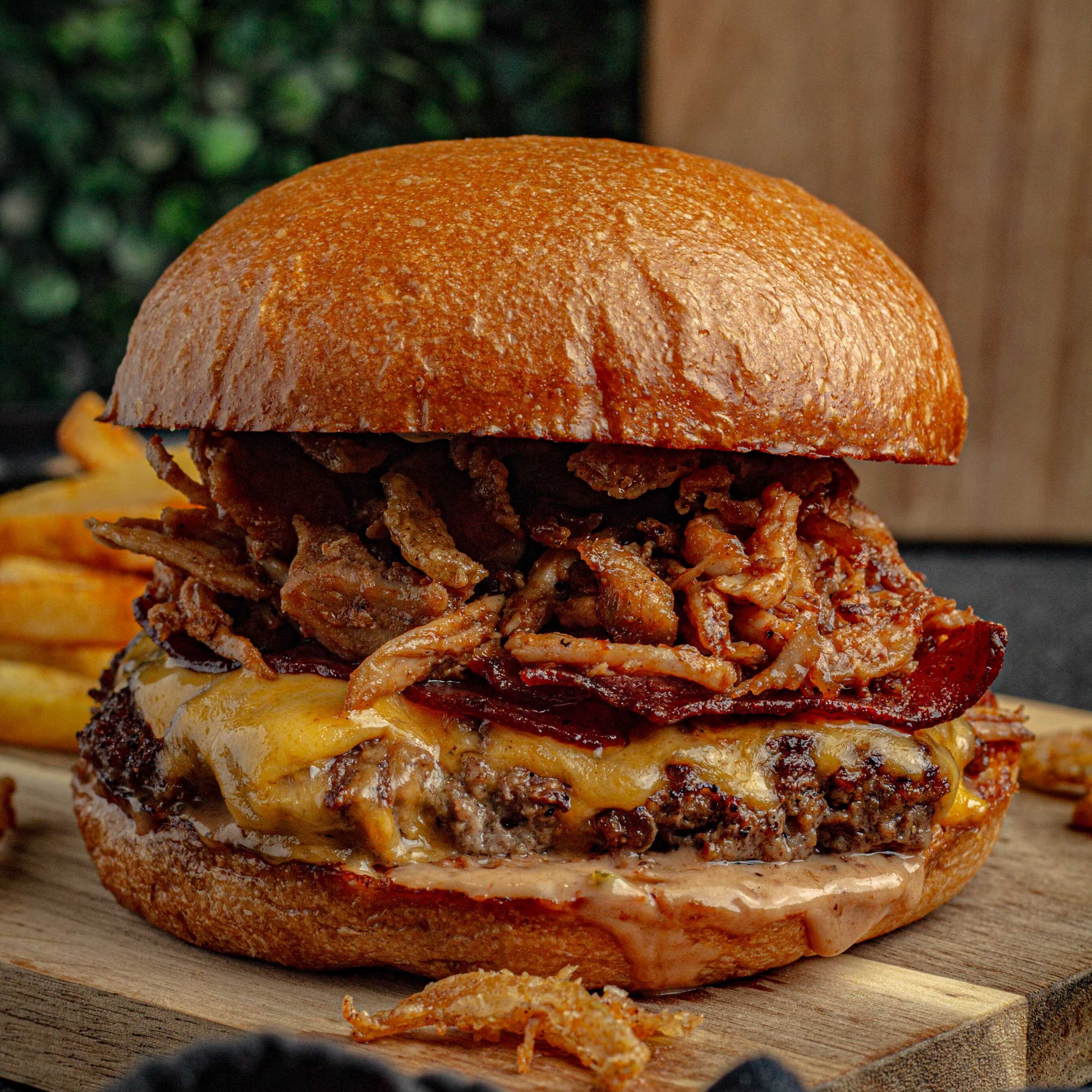 an brioche, 150 gr de carne Angus, Pulled Pork, cebolla crispy, queso chedar, tocineta ahumada artesanal, salsa secreta de la casa y papas a la francesa