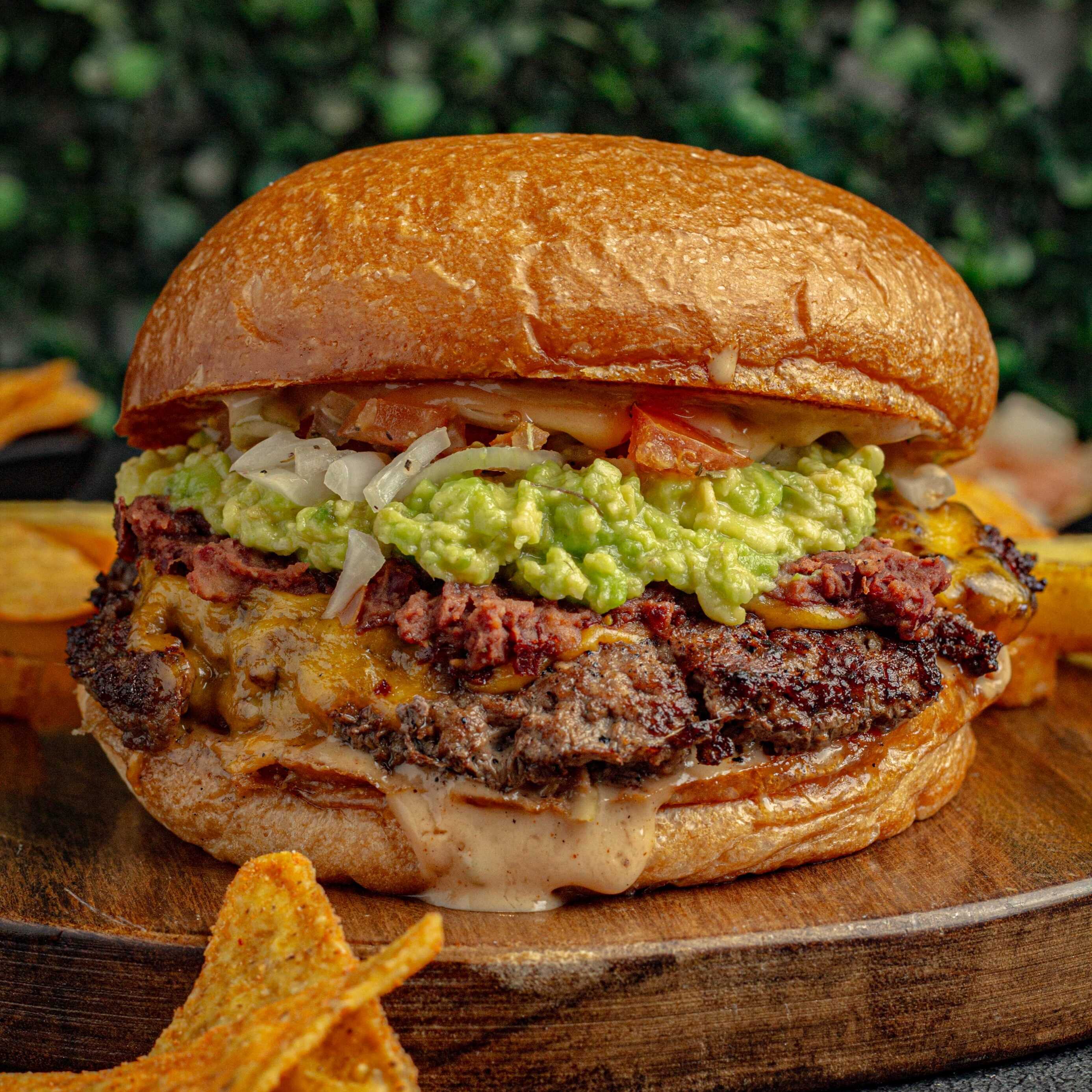Pan brioche, 150 g de carne Angus Beef ®, queso cheddar, pico de gallo, frijoles refritos, tocineta ahumada artesanal, nachos, guacamole, salsa chipotle, salsa secreta de la casa y papas a la francesa