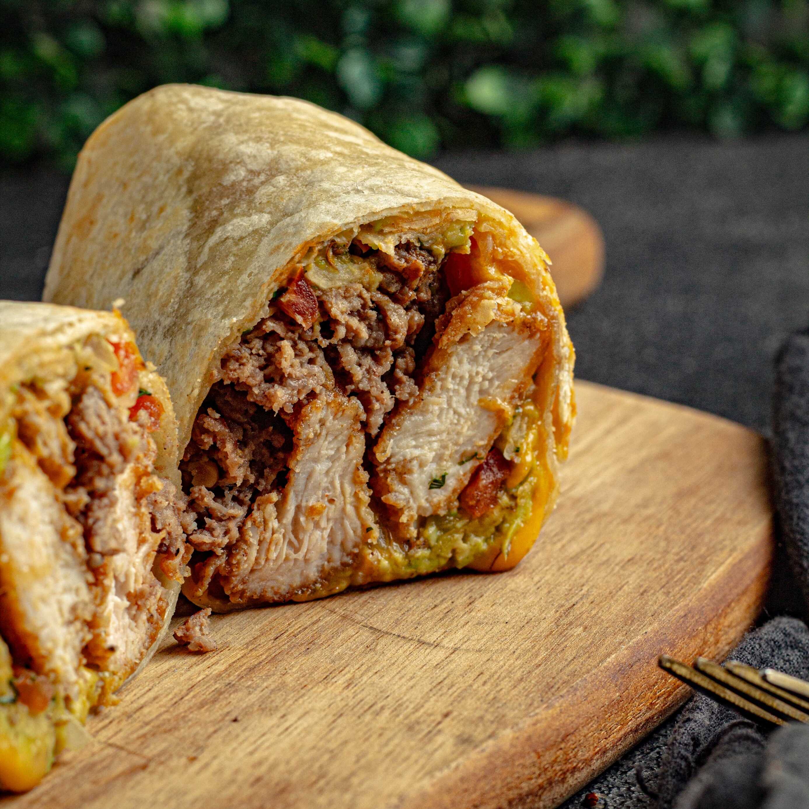 Tortilla de harina, queso cheddar, pico de gallo, guacamole, carne angus, pollo crispy y salsa de la casa.