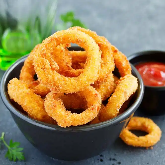 5 unidades de crujientes aros de cebolla acompañadas de nuestra salsa de la casa