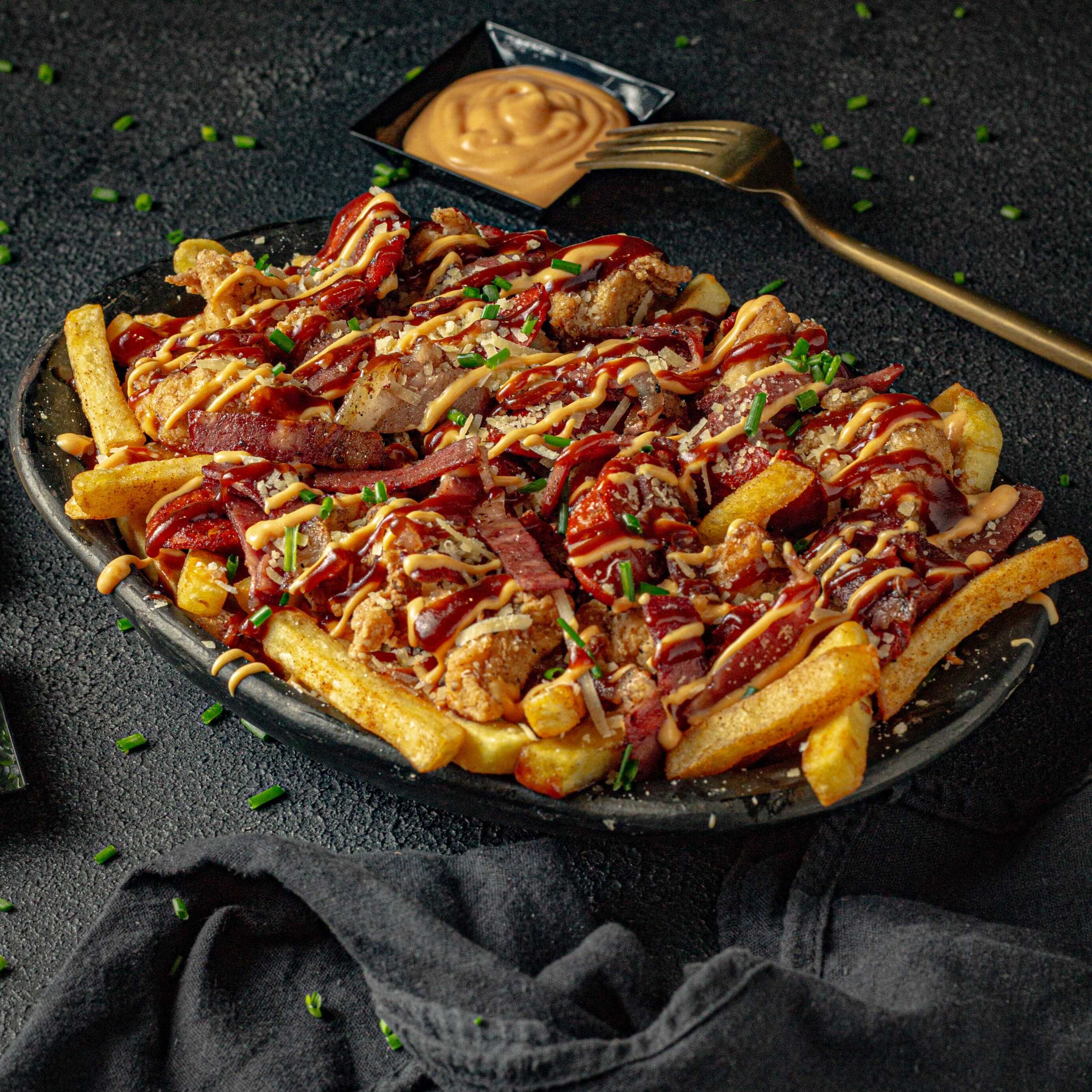 Papas francesas, chorizo campesino artesanal, lomitos de pechuga crispy, tocineta ahumada artesanal, queso parmesano, salsa bbq, salsa de queso chedar.
