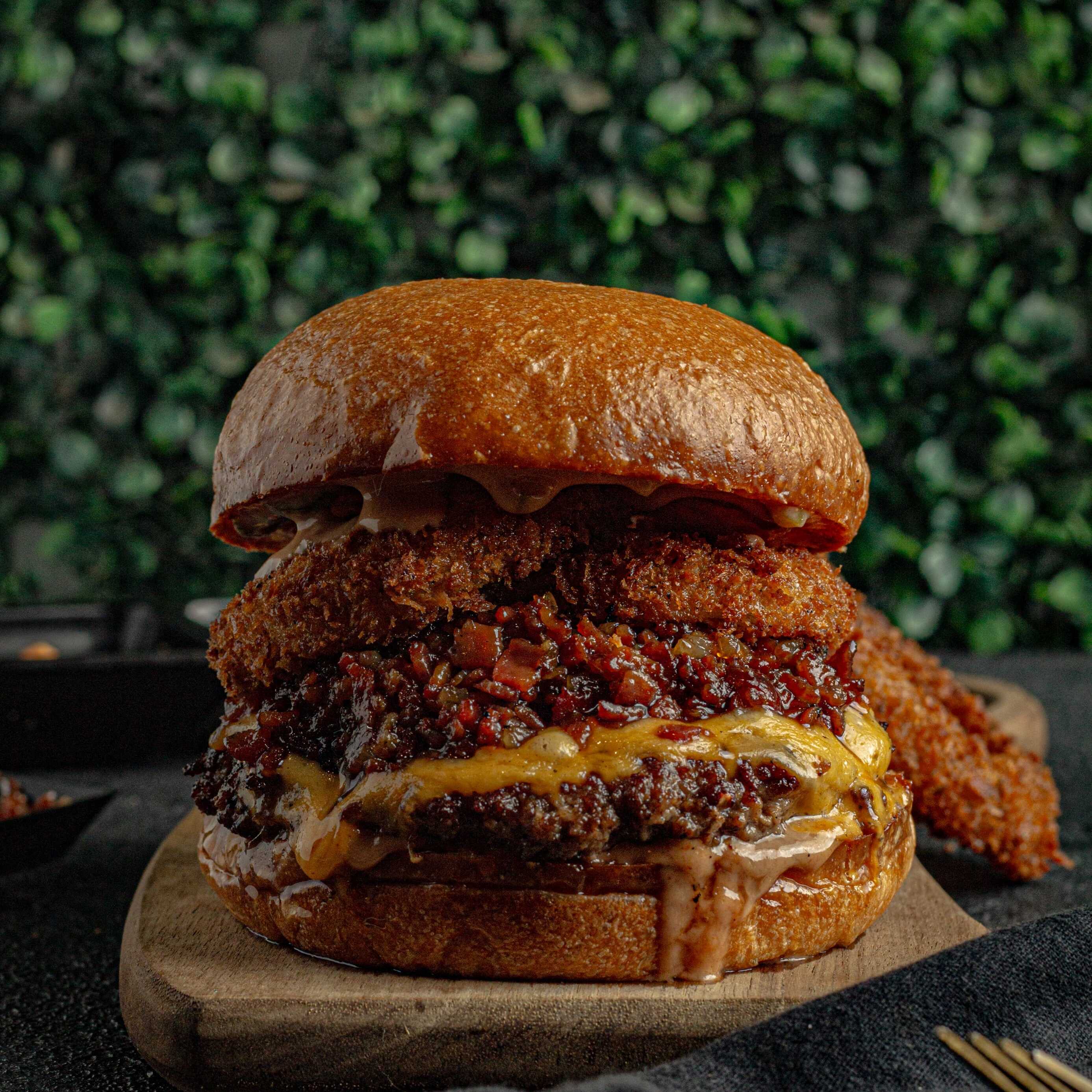 Pan brioche, 150 g de carne Angus Beef ®, chorizo campesino artesanal, cebolla crispy, queso cheddar, tocineta ahumada artesanal, virutas de plátano, salsa secreta de la casa y papas a la francesa