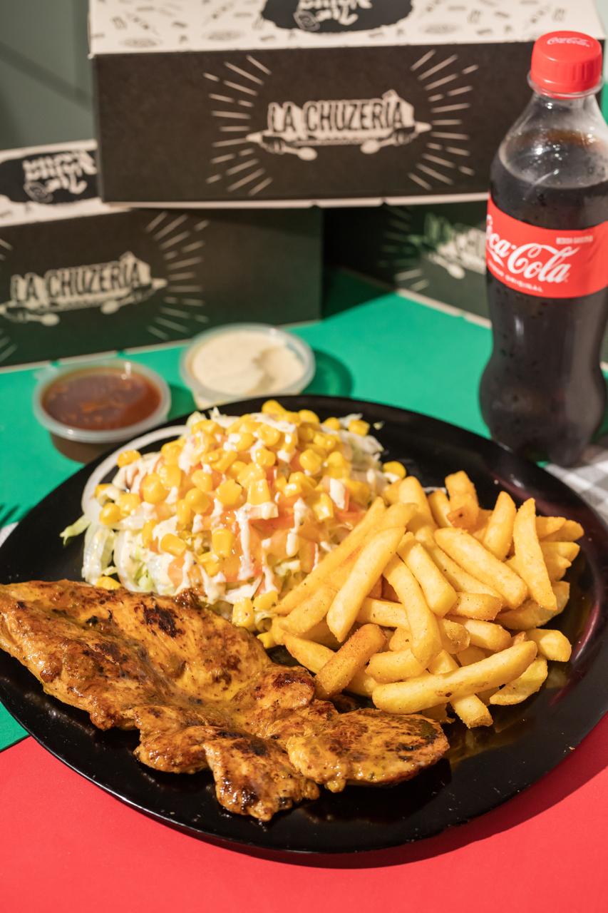 Filete de pechuga asado al grill, papas a la francesa o bollo artesanal y ensalada.