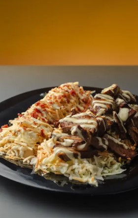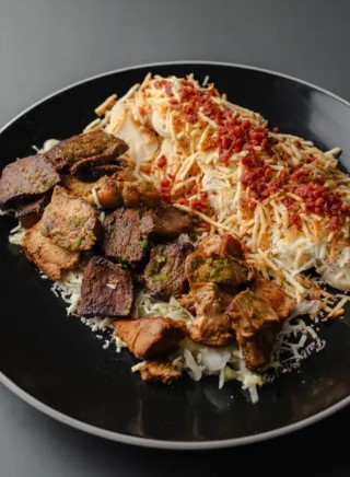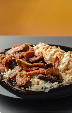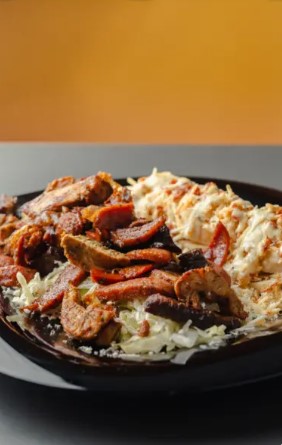 Maíz tierno, carne, queso costeño, papita ripio y tocineta crocante.
