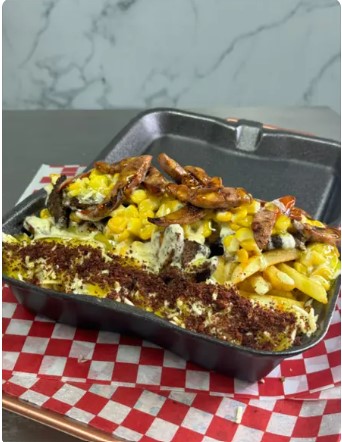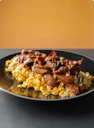 Maíz tierno, queso costeño, papita ripio y tocineta crocante.