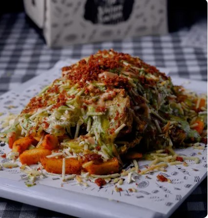 Papa a la francesa, pollo, salchicha suiza, queso costeño, papa ripio, ripio de tocineta, salsa mayo cilantro, salsa rosada y salsa piña.