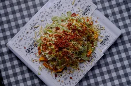 Lechuga, queso costeño, papa ripio, tocineta crocante, salsa tártara y piña.