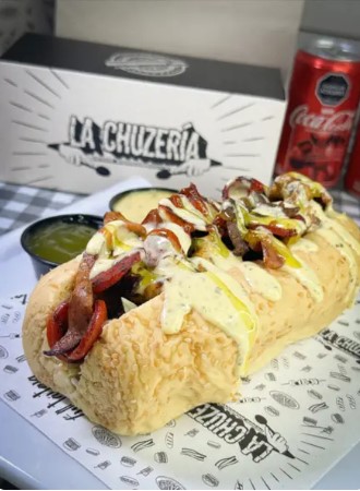 Bollo artesanal, carne, pollo, maíz, salchicha suiza, papa a la francesa, papa ripio, tocineta crocante, salsa tártara y piña.