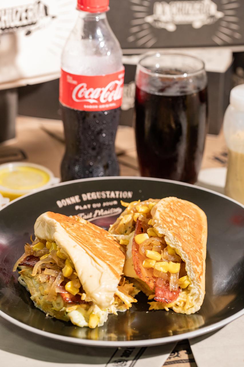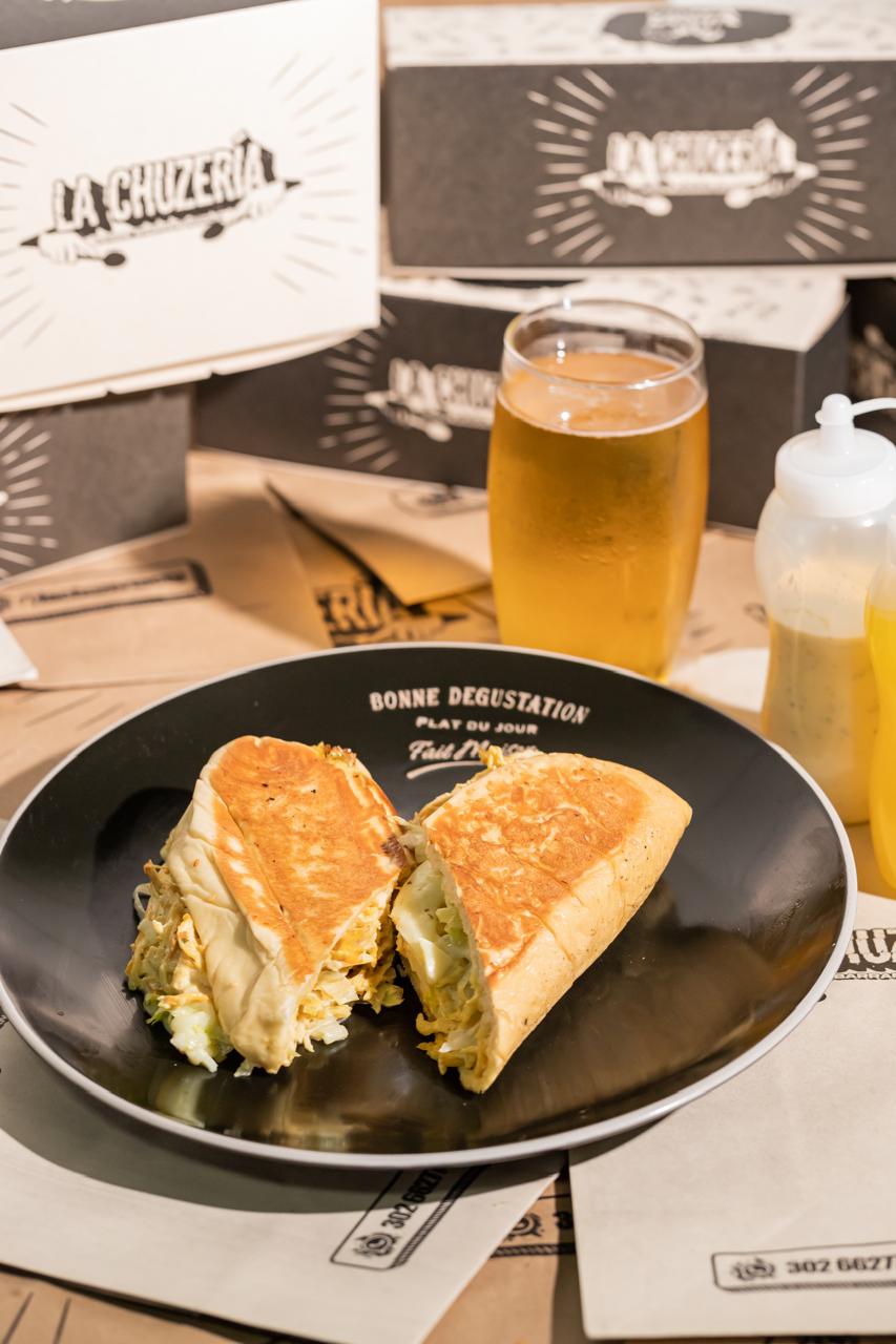 Bollo artesanal, pollo, queso gratinado, mermelada de tocineta, queso costeño, lechuga, papita ripio, tártara y piña.