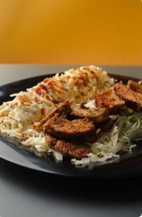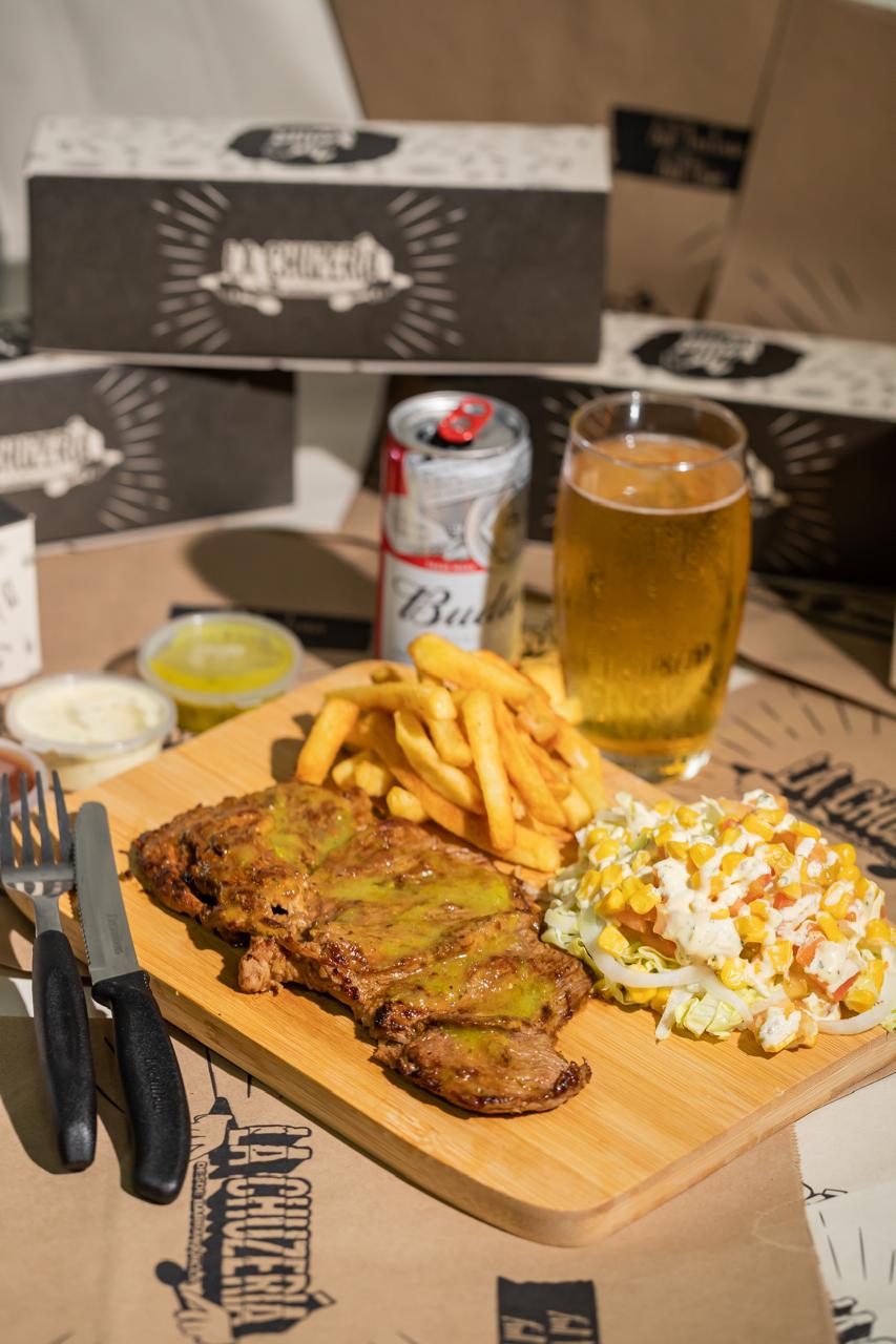 Lomo de res asado al grill, acompañado de pure cremoso de yuca o papas a la francesa y ensalada coleslaw.