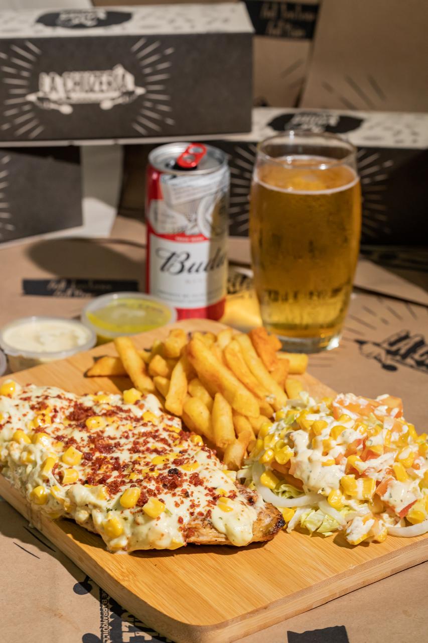 Acompañada de papa francesa o bollo artesanal y ensalada fresca de tomate, cebolla y lechuga.