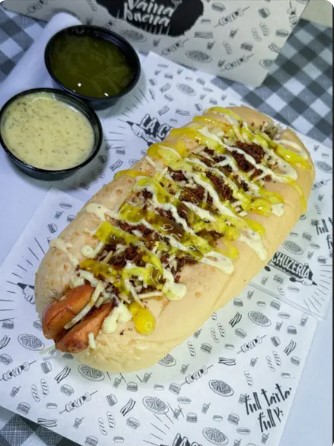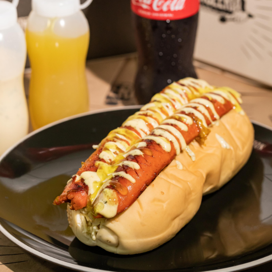 Salchicha americana, lechuga, queso costeño, papita ripio, tocineta crocante, salsa tártara y piña.