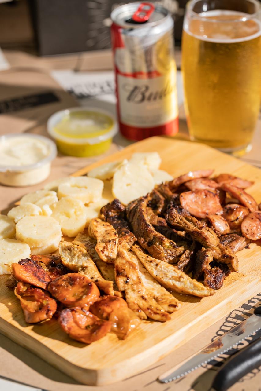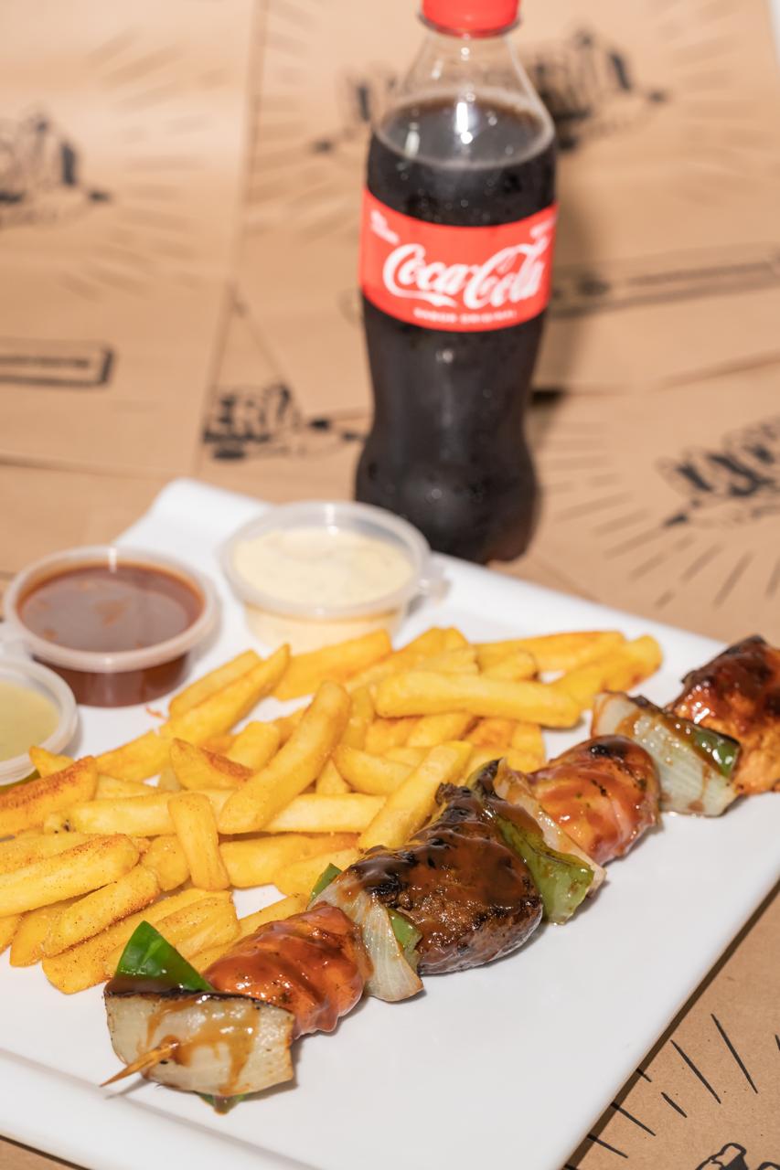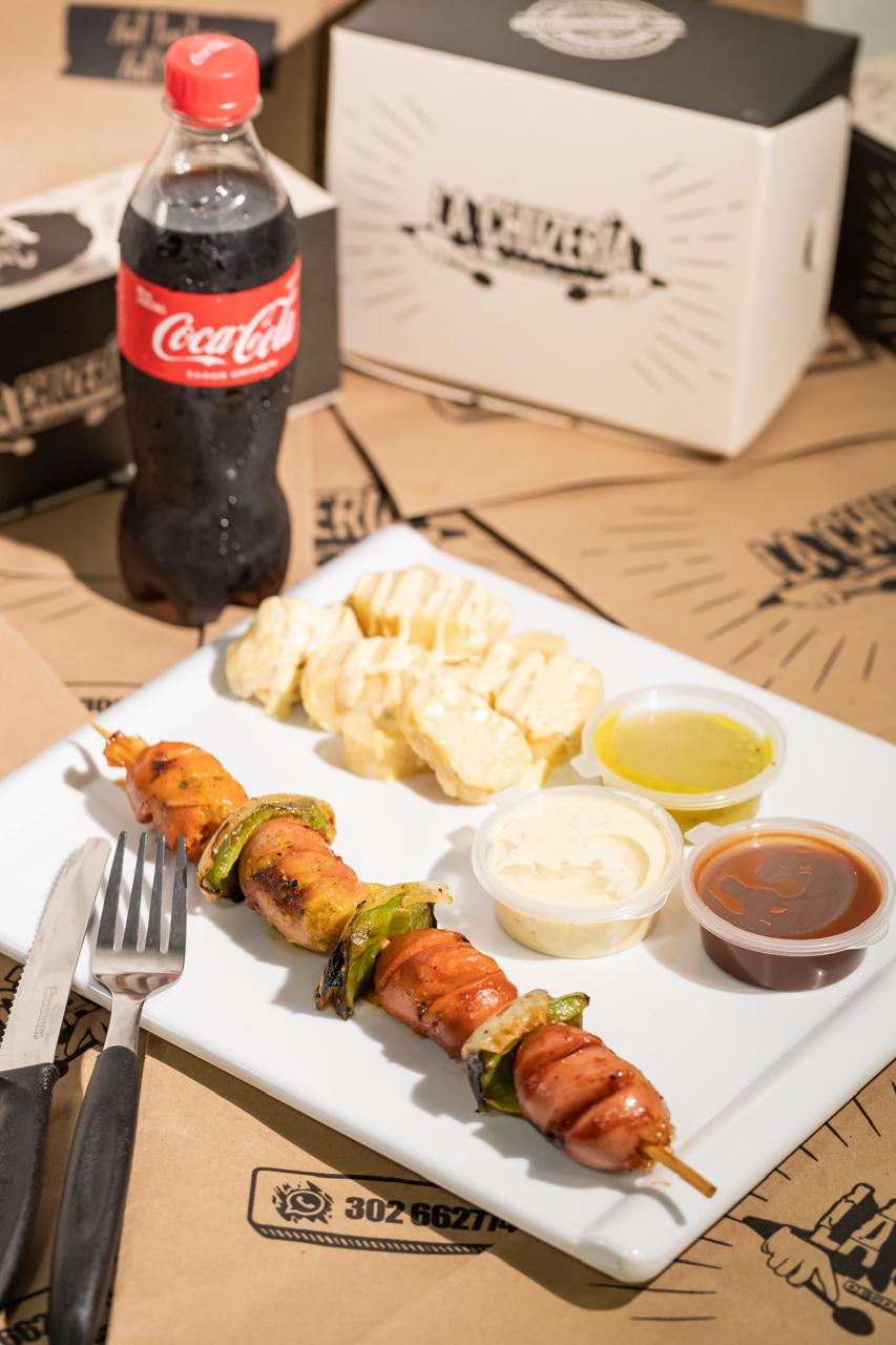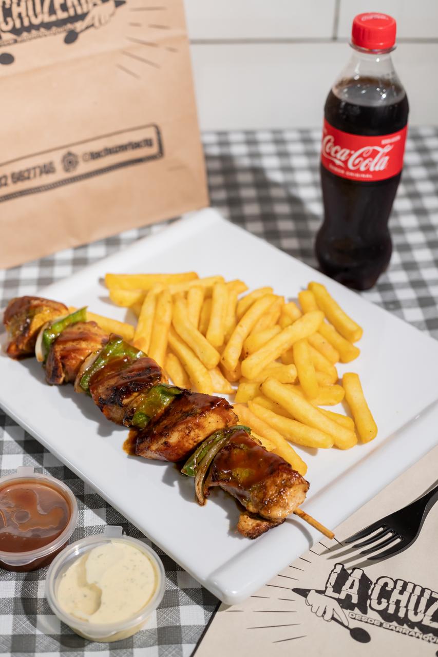 Ideal para compartir entre 2 a 3 personas, nuestro delicioso chuzo combinado pero en tamaño de caja de pizza, adicionamos salchicha suiza, maíz y gratinado para un experiencia repleta de sabor.
