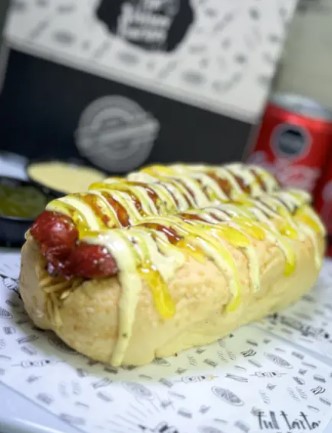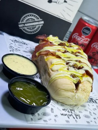 Bollo artesanal, chorizo, butifarra, bollo artesanal, queso costeño, lechuga, tocineta crocante, papita ripio y salsa tártara y piña.