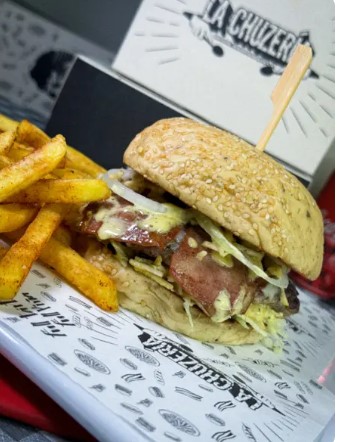 Pan, carne smash, queso mozarela, tocineta, piña en trocitos confitada, papa ripio, salsa tártara y piña, acompañada con papas a la francesa.