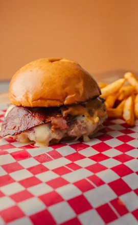 Pan, smash de carne americana, doble tocineta ahumada, doble queso cheddar, cebolla caramelizada y salsa especial de la casa, acompañada con papas a la francesa.