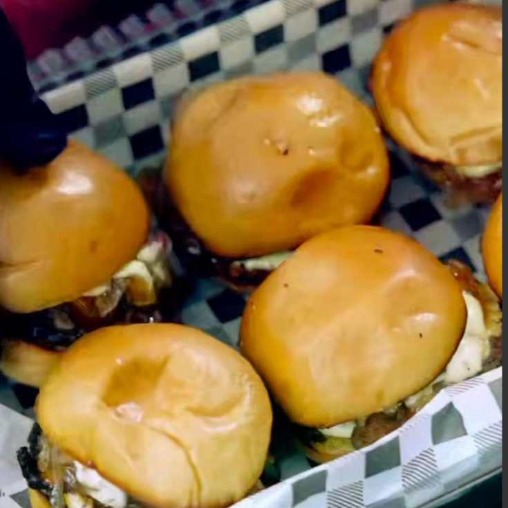 6 Mini hamburguesas, con carne angus, tocineta, queso cheddar y cebolla caramelizada.
