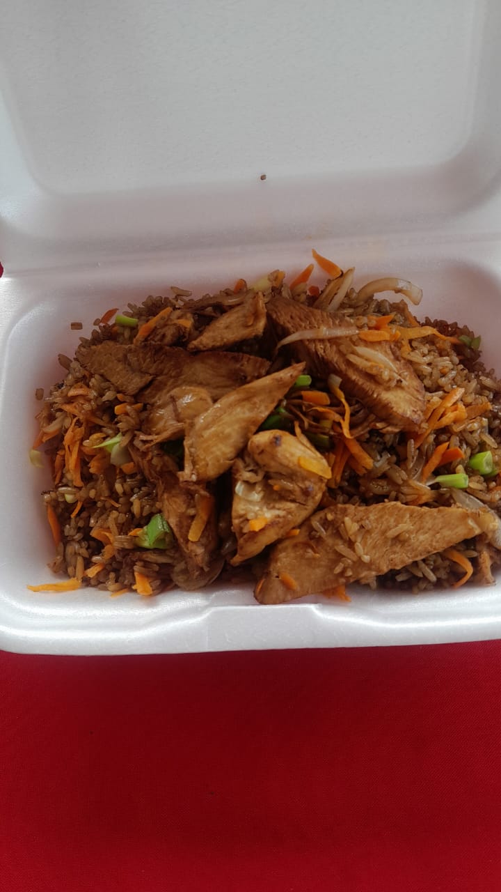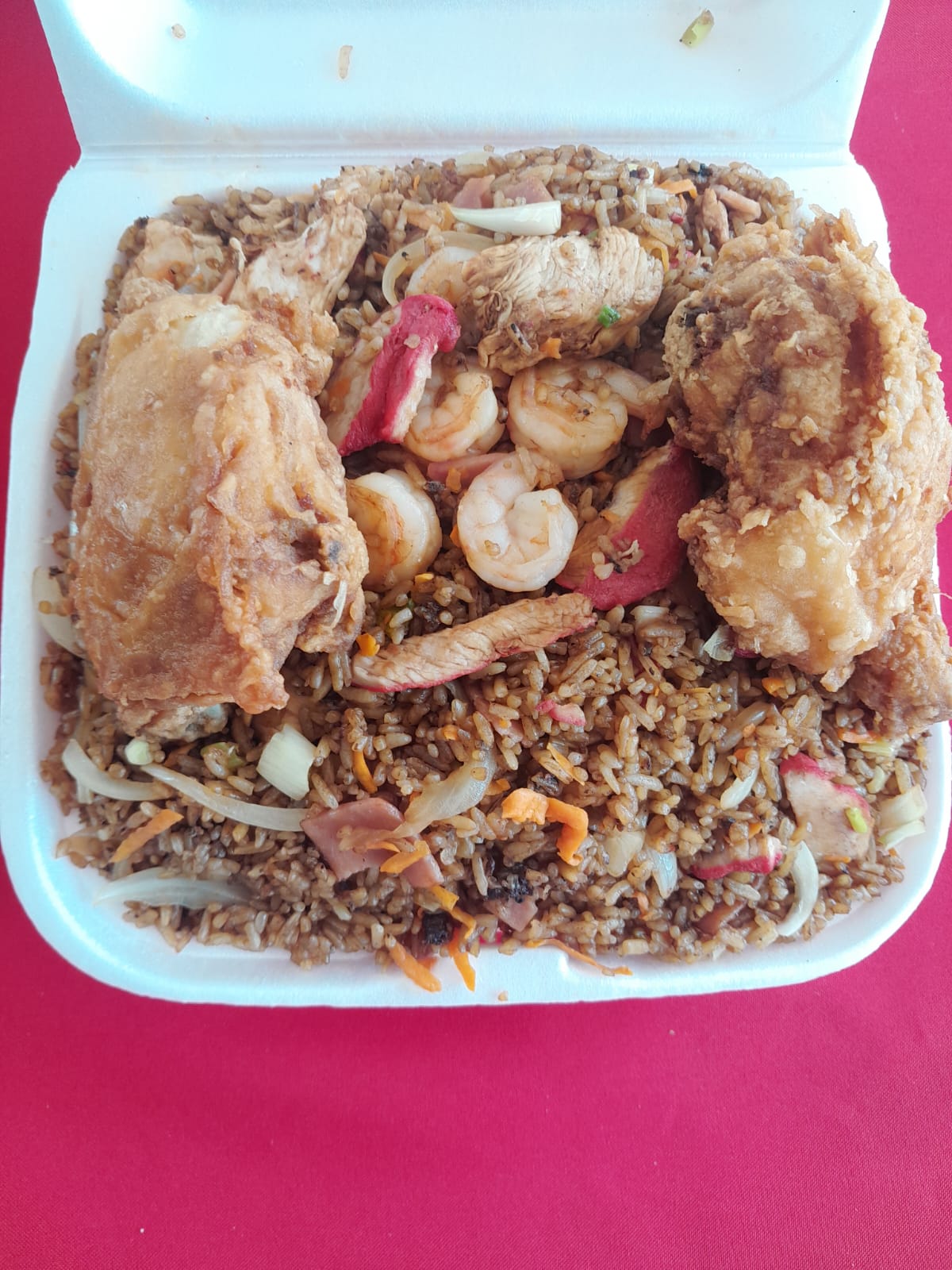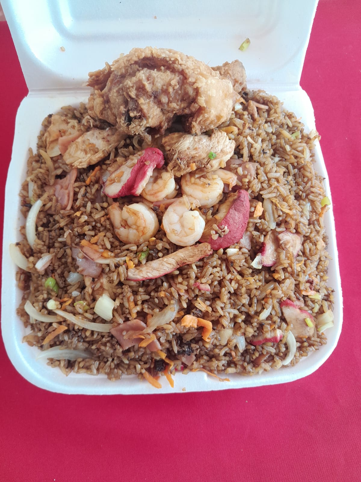 Arroz, cerdo, pechuga, camarón, pollo frito y verduras.