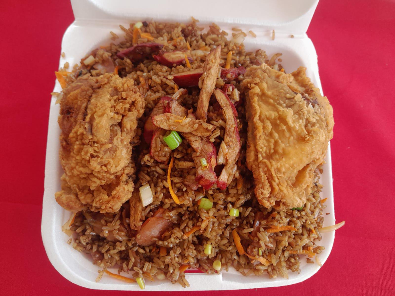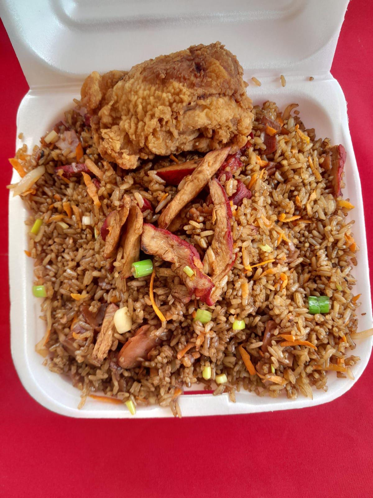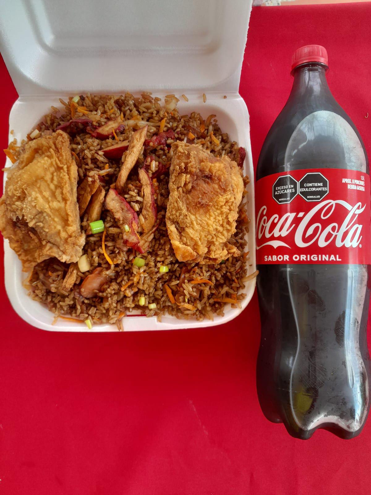 Porción de aproximadamente 650g de arroz preparado con cerdo picado, dos piezas de pollo frito y una mezcla de verduras frescas: cebolla, zanahoria y cebollín. + Coca Cola.