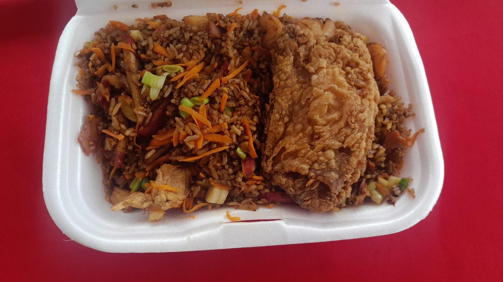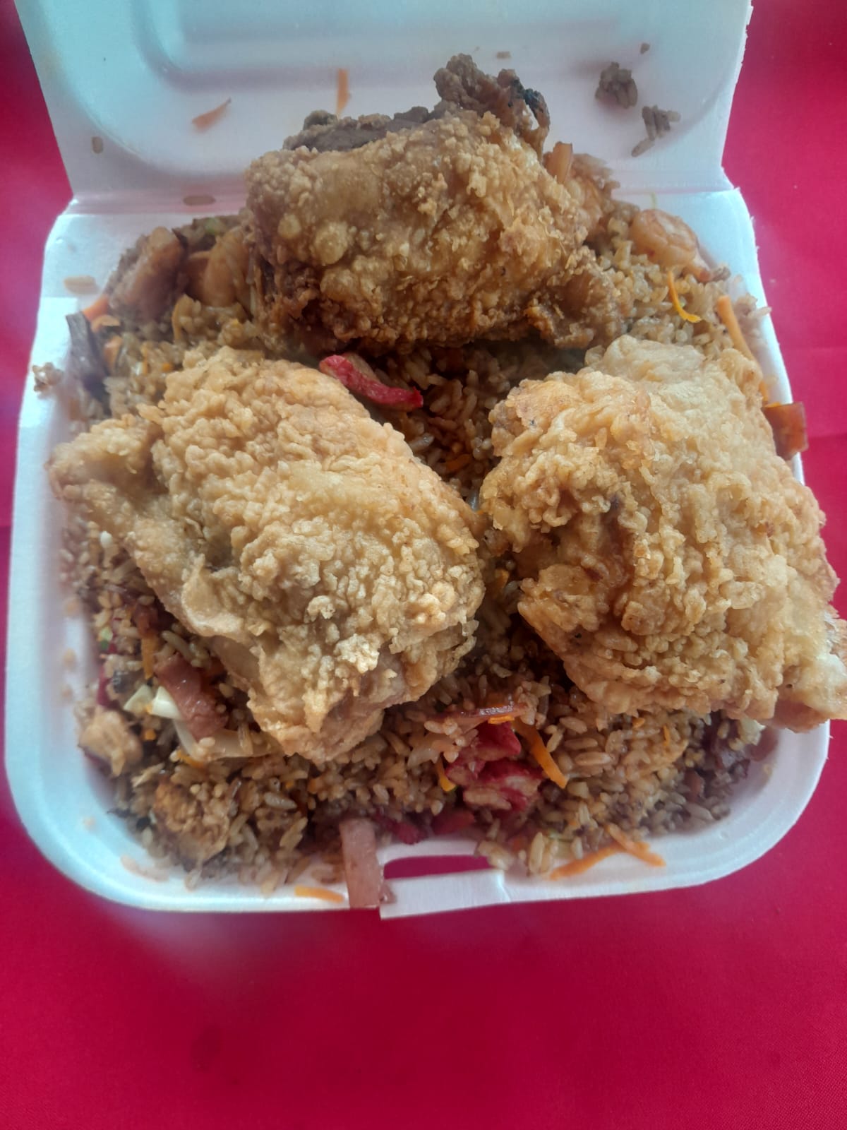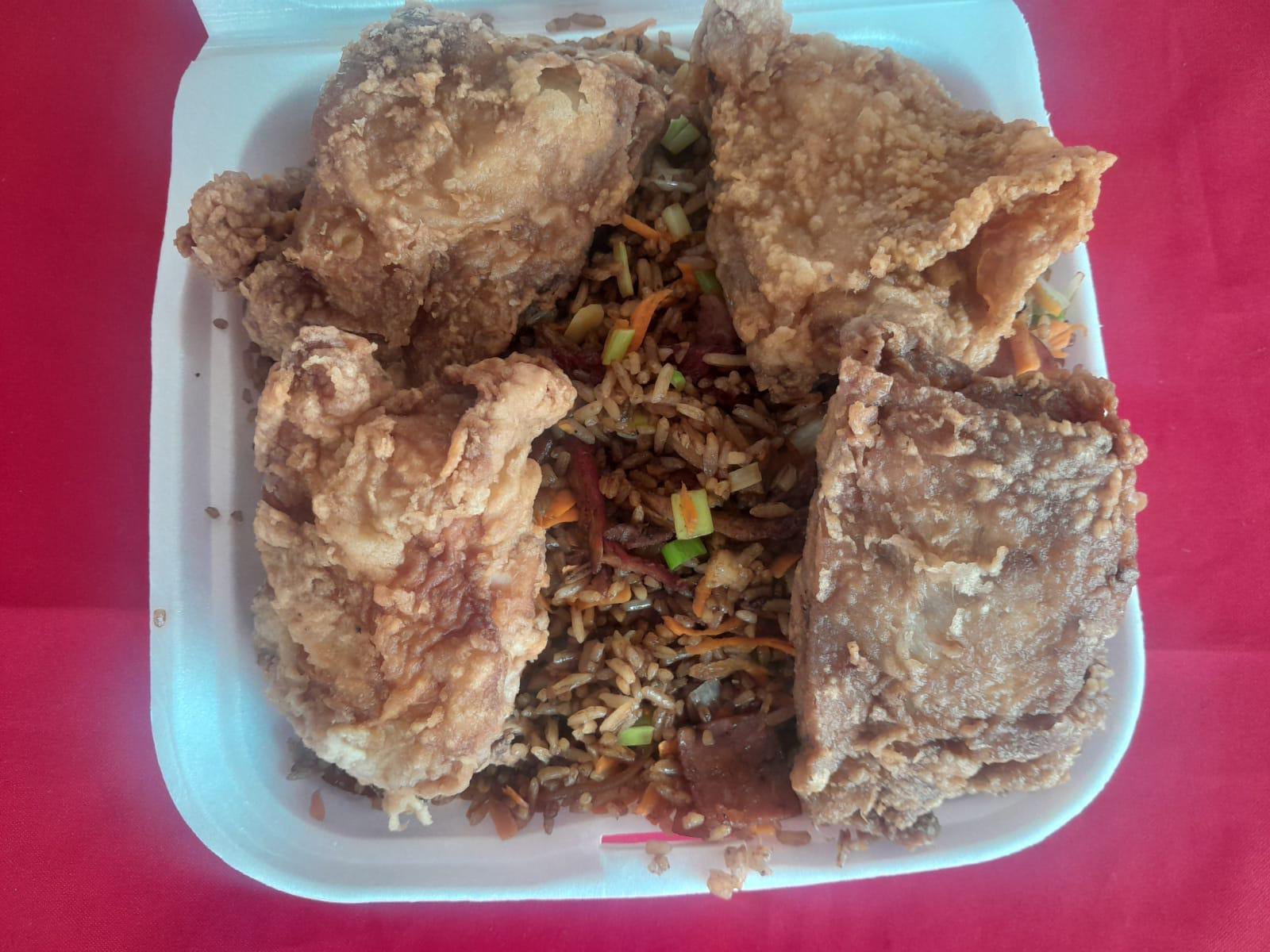 Porción de aproximadamente 650g de arroz preparado con cerdo picado, dos piezas de pollo frito y una mezcla de verduras frescas: cebolla, zanahoria y cebollín. + Coca Cola.
