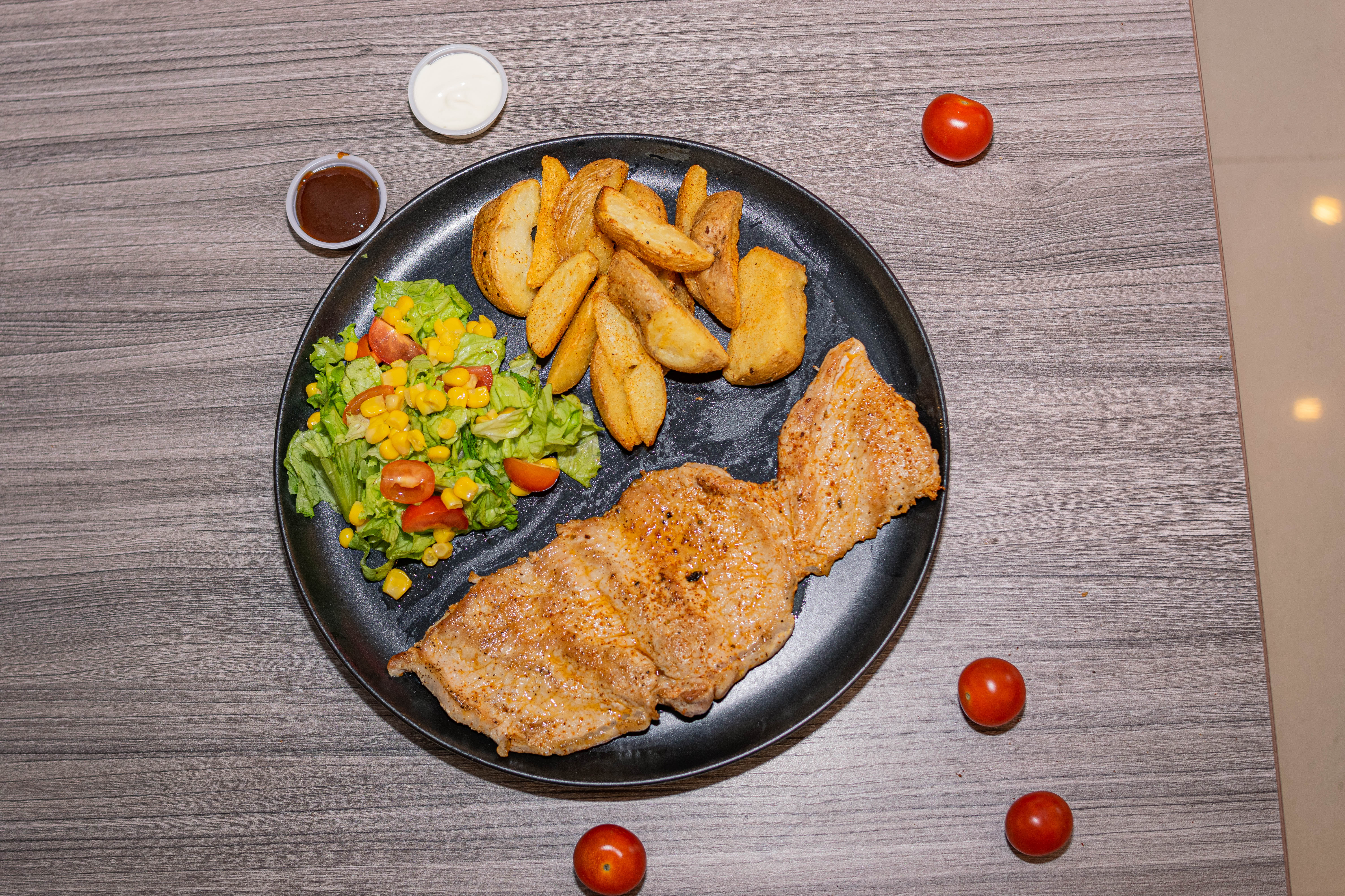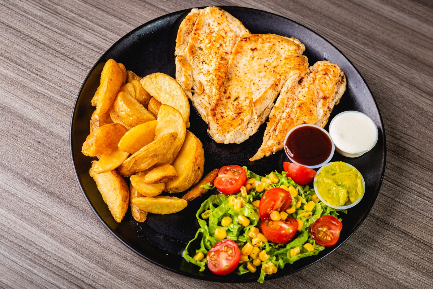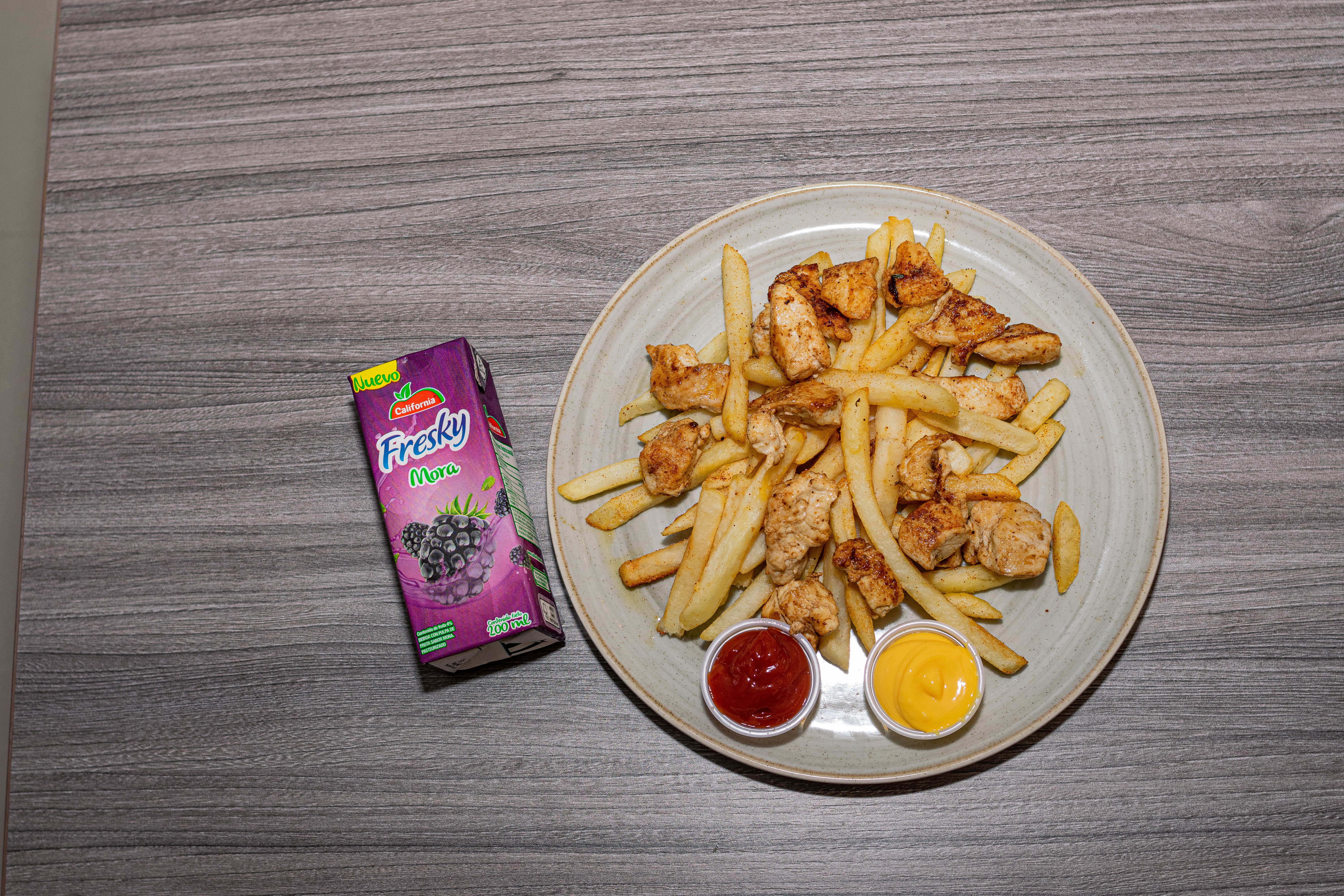 Pollo a la plancha, papa francesa, jugo cajita o natumalta.
