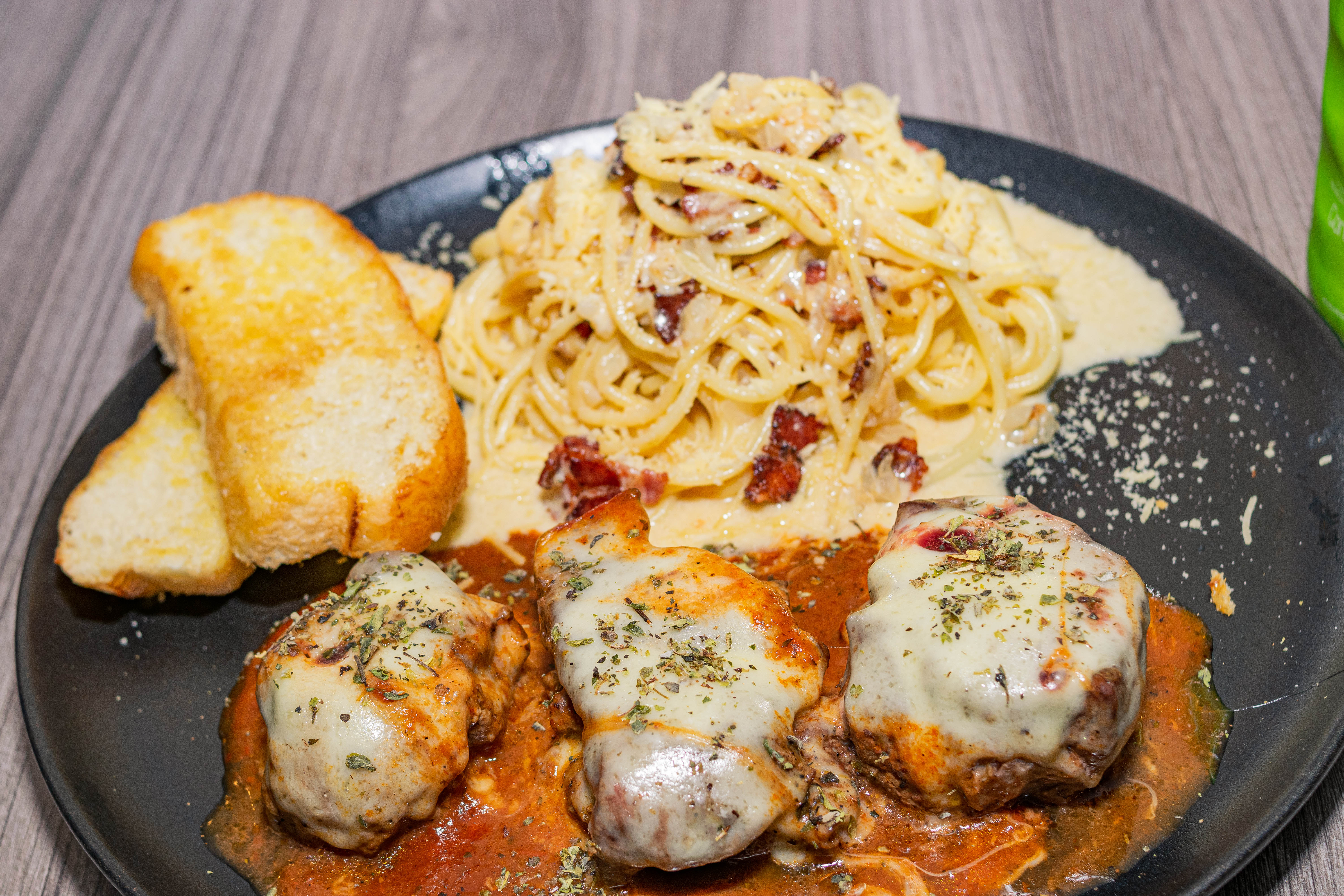 Pasta vermiselli, Tocineta, cebolla blanca, salsa blanca y queso parmesano.