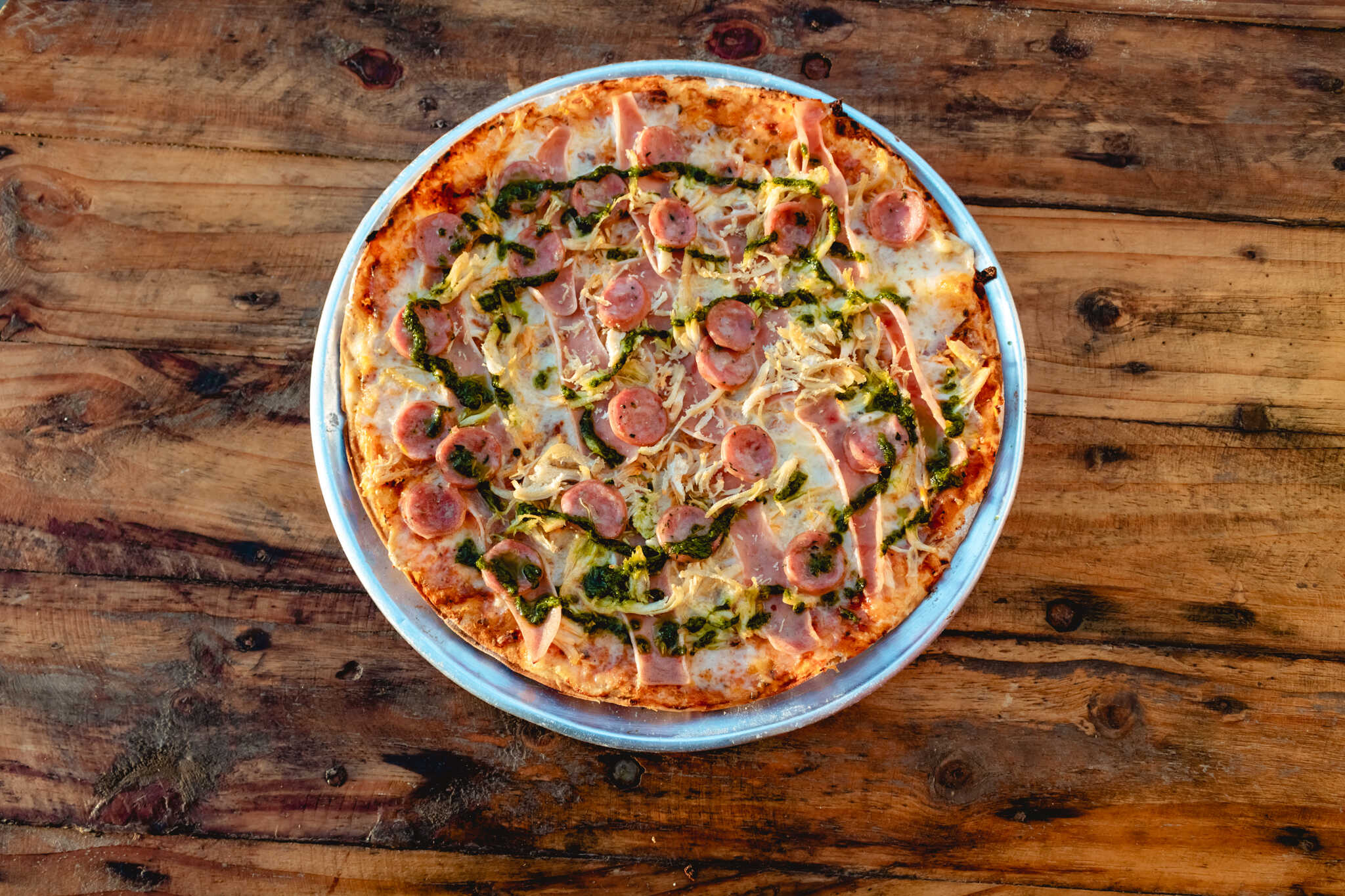 Mozzarella, chorizo estilo gaucho, salsa pestare, pollo, jamón ahumado.