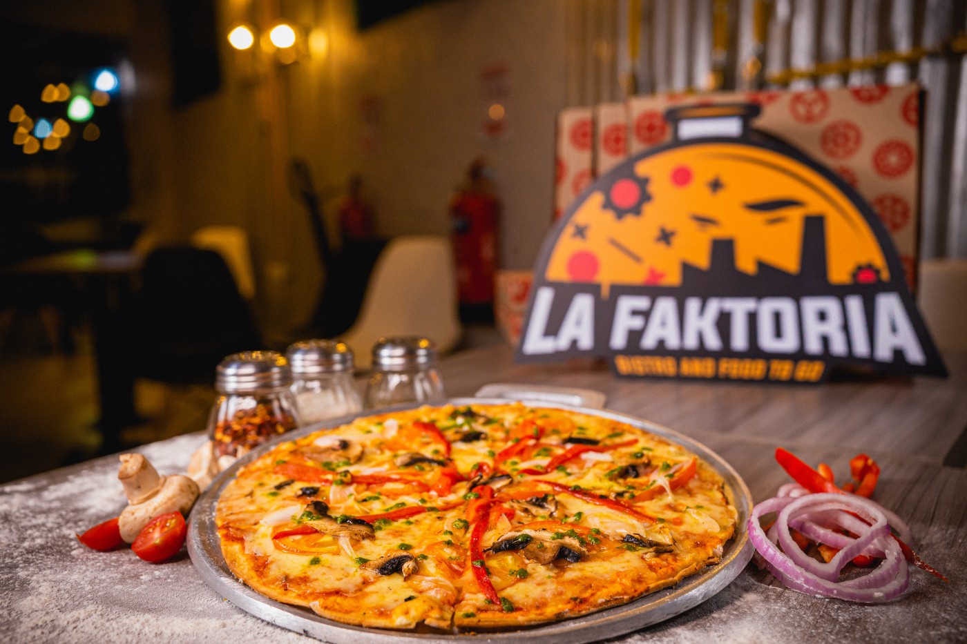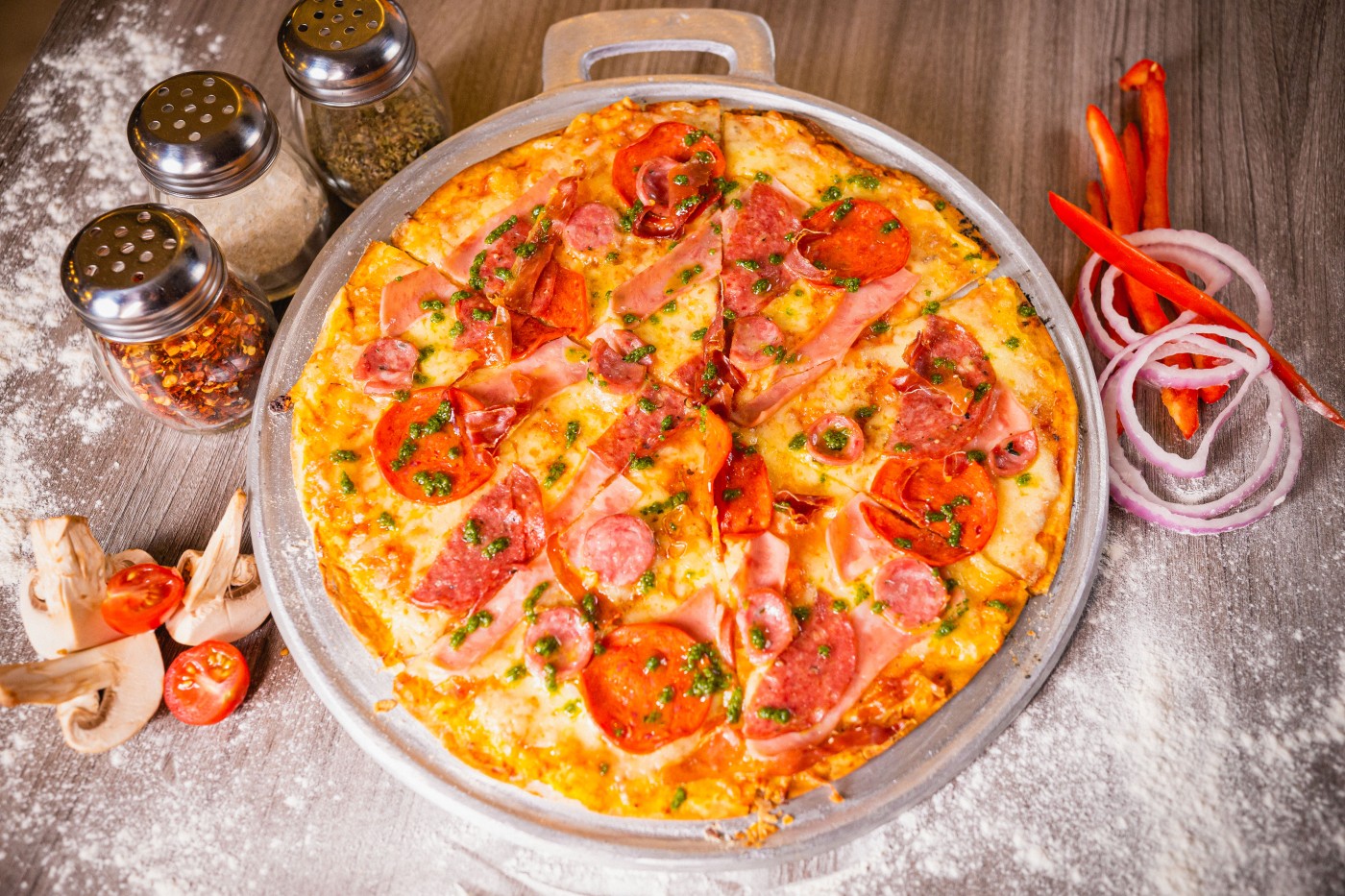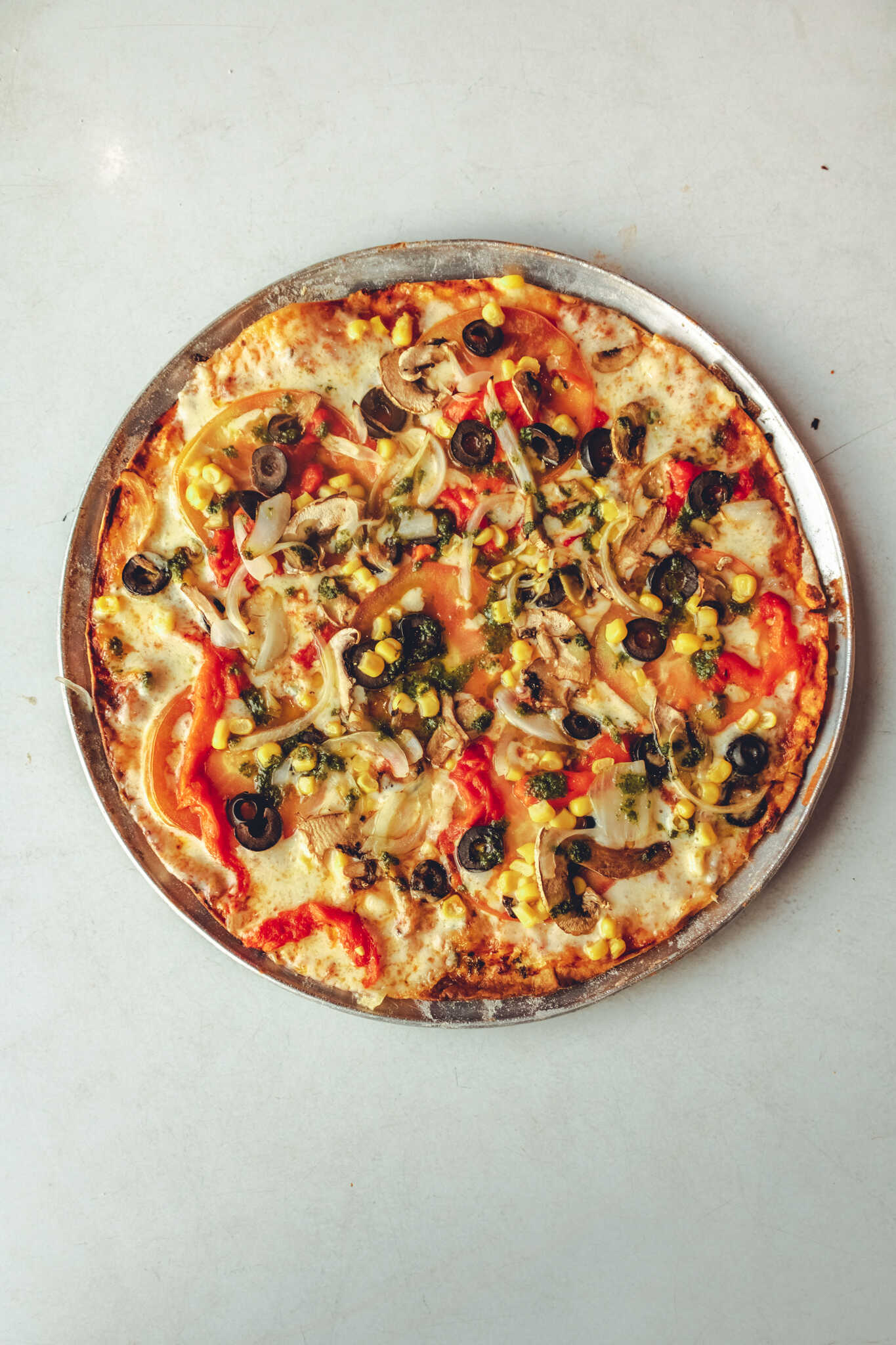 Mozzarella, tomate, salsa pesto, pimentones encurtidos, cebolla blanca, champiñones, maíz y aceitunas negras.